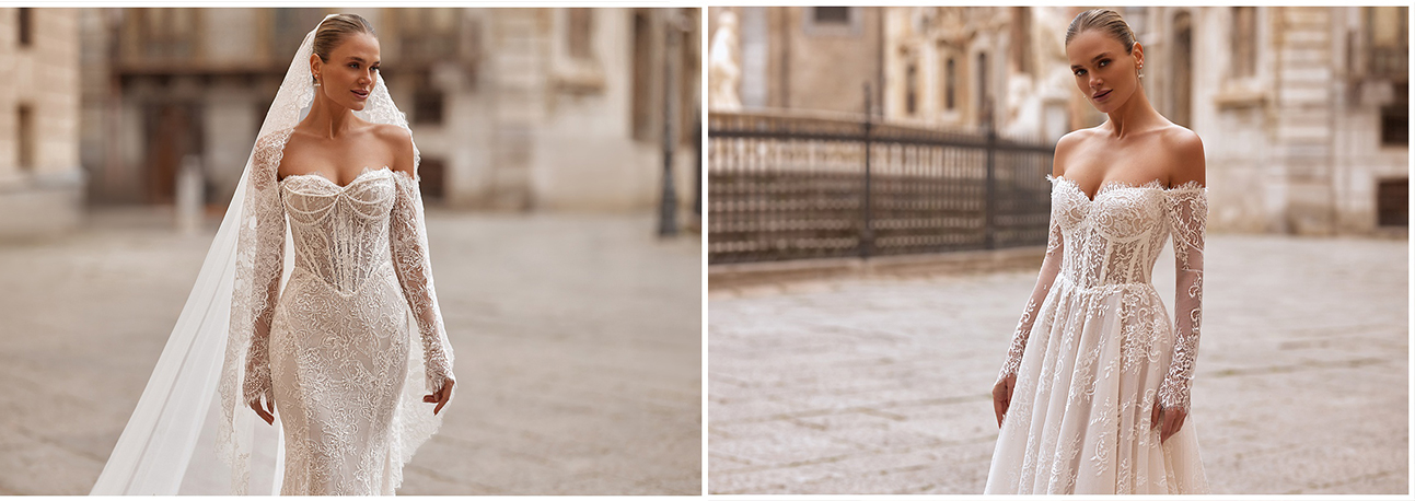 Această rochie de mireasă eleganta și sofisticată de tip „sirena” este realizată dintr-o dantelă fină și delicată, care conferă o notă romantică. Corsetul de culoare nude cu maneci lungi adaugă un aspect rafinat și plin de mister. Decolteul și spatele în formă de V adaugă un element sexy și sugestiv. Un accesoriu spectaculos, care se prinde pe bust, completează întregul ansamblu și oferă o notă regală și aristocratică, aducând o doză de glamour. Această rochie este alegerea perfectă pentru o mireasă care vrea să strălucească în ziua cea mare.