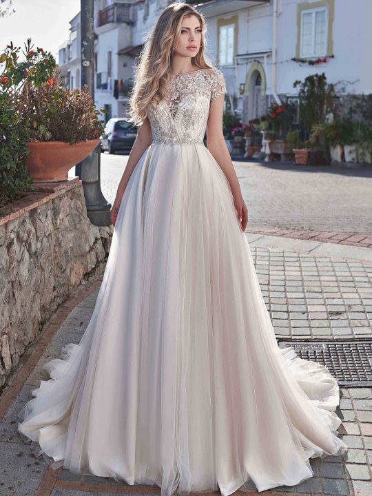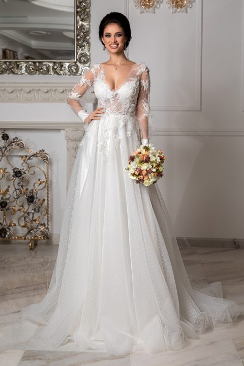 Rochia de mireasa Begonia este o rochie caracterizata de eleganta si rafinament. Partea de sus a rochiei este decorata cu dantela inflorata si pietricele, iar fusta uimeste prin simplitatea ei si prin croiala superba. Este genul de rochie pe care cu siguranta l-ar purta una dintre printesele din povesti daca ar trai in ziua de astazi.  Daca vreti o rochie tip printesa comoda si fara prea mult volum in partea de jos, atunci o sa va placa modelul Cozenza. Este o rochie superba, cu accent in partea de sus a rochiei, unde intalnim un model floral din dantela si strasuri, cu talia accentuata, iar fusta este invaluita de tulle pentru un efect artistic. Ar putea fi cu siguranta rochia de vis a oricarei fete.  Iar daca va plac rochiile de mireasa cu aspect vintage, atunci trebuie sa probati rochia Iris. Este realizata din tulle cu buline, are maneci bufante, mansete cu nasturi si o trena eleganta, foarte comoda, care nu o sa va impiedice miscarile. Acestea au fost recomandarile noastre de rochii de mireasa tip printesa cu maneci. Speram ca v-am inspirat si ca o sa alegeti un astfel de model pentru a-l purta la nunta!