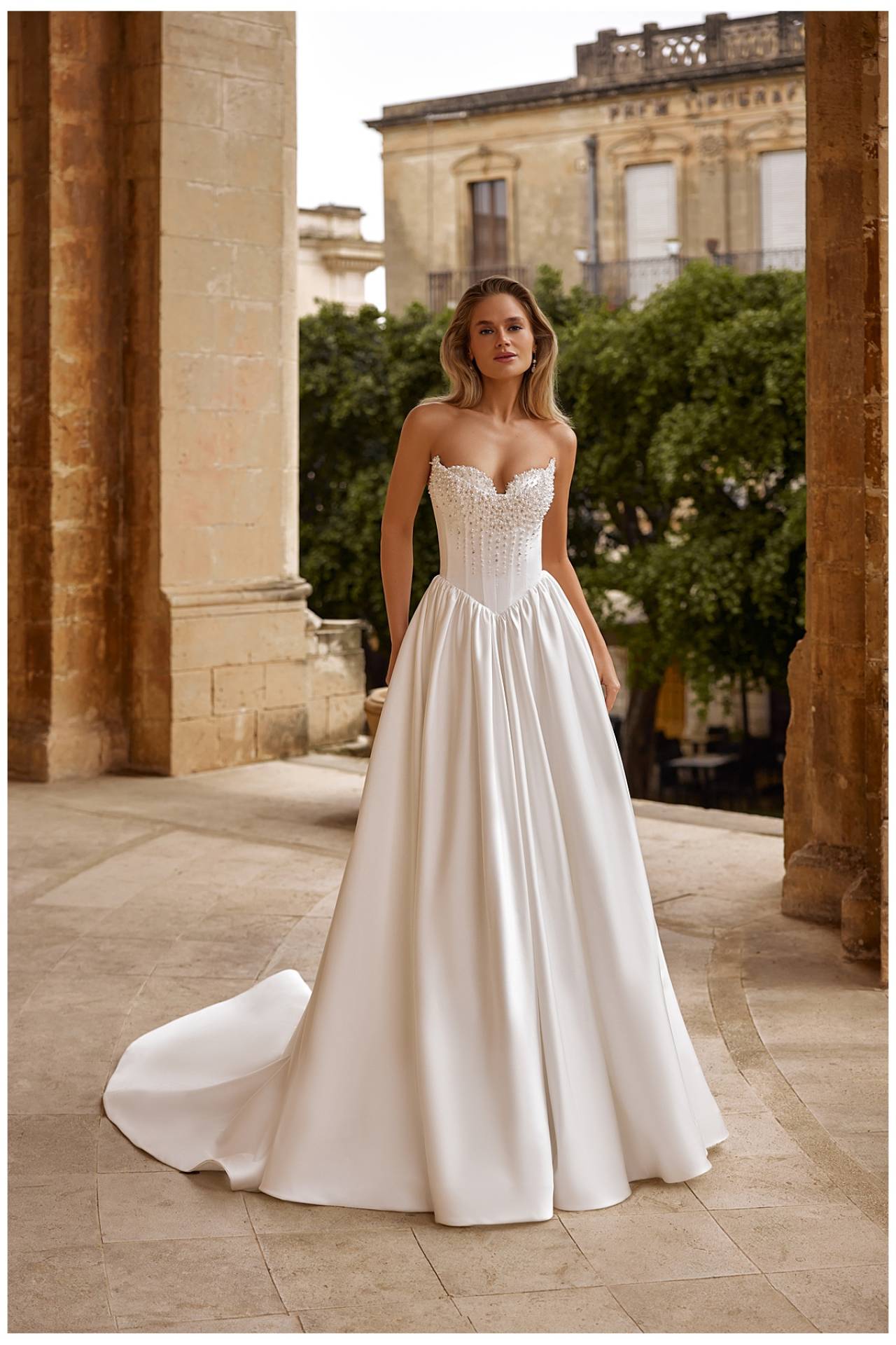 Talia este marcată subtil, creând o tranziție armonioasă către fusta amplă. Această construcție atent gândită face din Azura o rochie de mireasă cu corset ideală pentru miresele care își doresc un echilibru între structură și lejeritate, între design modern și feminitate clasică.