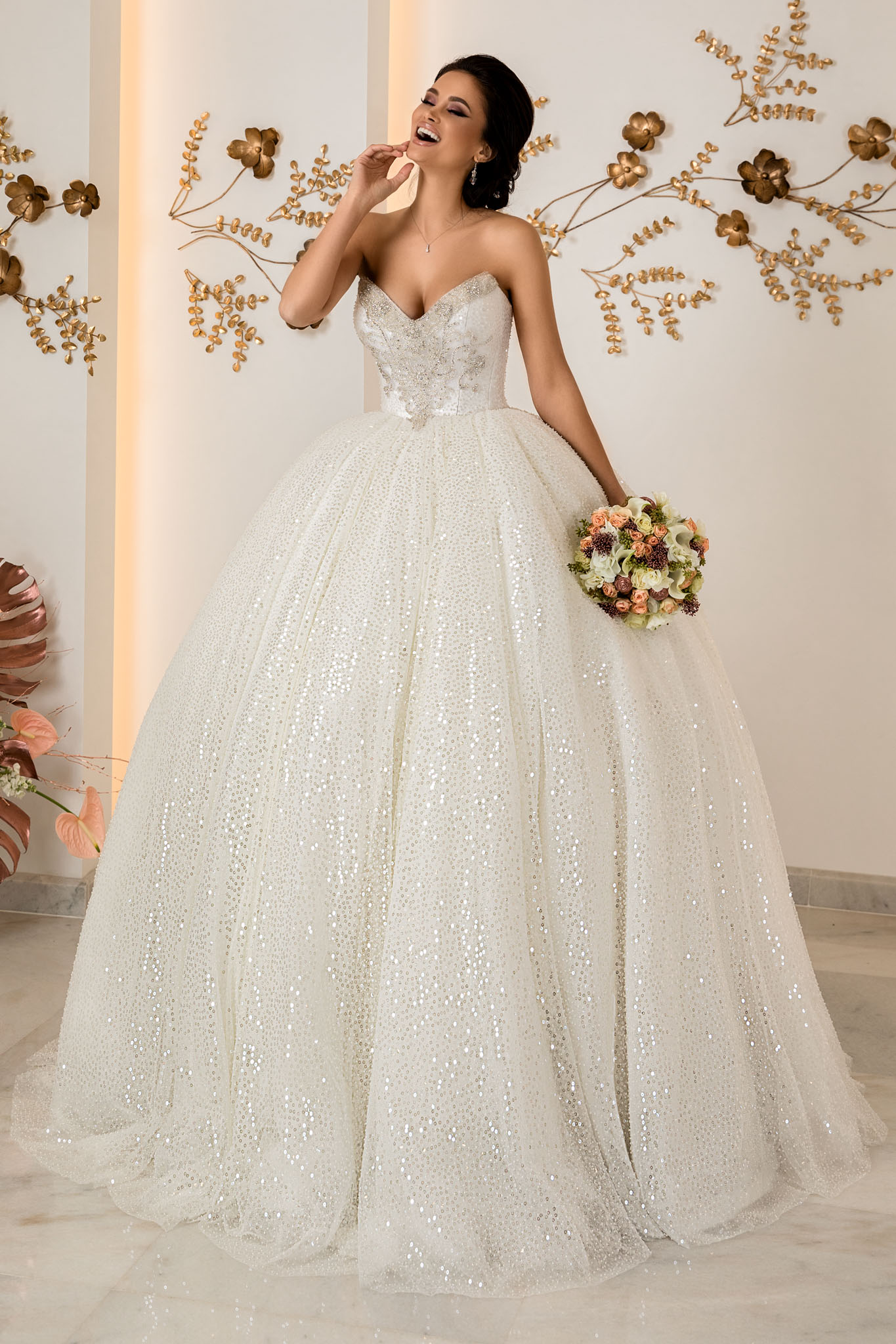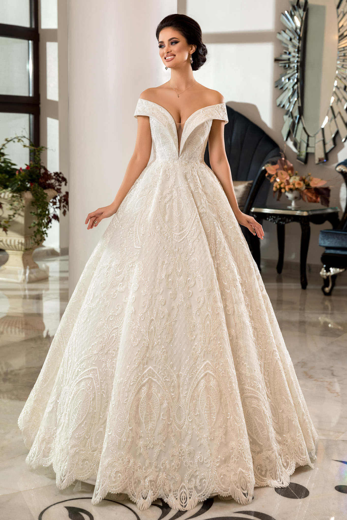 Daca va doriti o rochie care sa impresioneze printr-un aer regal si opulenta, o adevarata rochie de printesa, va recomandam Rochia de mireasa Sandonyxe. Este o rochie incantatoare, potrivita chiar si mireselor care isi doresc un look vintage, datorita dantelei superbe care imbraca rochia, dar si a paietelor chic. Bretelele cazute ii confera un aer romantic si un plus de senzualitate. Va garantam ca imbracand aceasta rochie, o sa va simtiti ca o printesa adevarata!