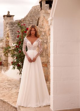 Descoperă eleganța și rafinamentul acestei rochii de mireasă A-line, care îmbină perfect tradiția cu un aer modern. Fusta delicată din chiffon se așterne suav, oferind un fluiditate deosebită la fiecare pas, creând o siluetă grațioasă și etereală. Manecile lungi din dantelă adaugă un farmec vintage, îmbrăcând brațele cu un detaliu sofisticat, iar textura fină a dantelei completează cu măiestrie aspectul romantic al rochiei.