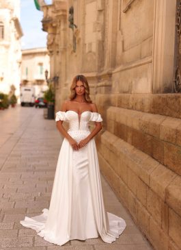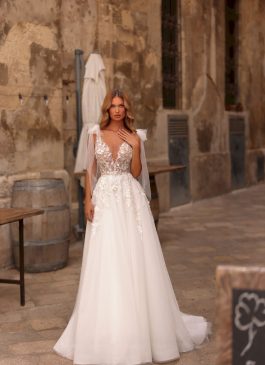 Culoarea ivory emană puritate și eleganță, fiind alegerea perfectă pentru o zi atât de specială. Spatele rochiei, închis cu un tulle nude delicat și împodobit cu nasturi, adaugă un strop de mister și un accent chic, lăsând o impresie de neuitat. Această rochie nu este doar un articol vestimentar, ci o poveste de dragoste materializată, pregătită să te învăluie în frumusețe și să îți însoțească pașii spre altar cu grație și stil. Fiecare detaliu a fost gândit cu atenție, pentru a te face să te simți ca o adevărată prințesă în cea mai importantă zi din viața ta.