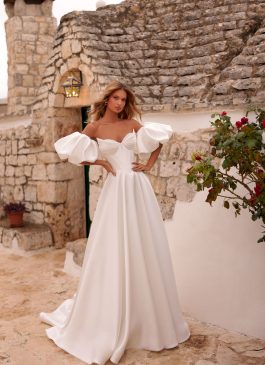 Descoperă eleganța atemporală a acestei rochii de mireasă A-line, realizată din satin mikado de o finețe desăvârșită, în nuanța rafinată ivory. Corsetul său în formă de V, cu balene delicate, pune în evidență silueta, în timp ce cupele deosebite adaugă un strop de romantism. Manecile detasabile bufante oferă versatilitate, permițându-ți să transformi look-ul pe parcursul zilei. Detaliul cu snur la spate completează perfect acest design sofisticat, făcându-te să te simți ca o adevărată prințesă în cea mai importantă zi din viața ta.
