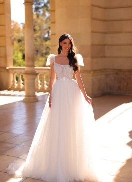 Rochia de mireasă este o capodoperă. Bustul ornamental cu dantelă conferă o notă clasică, iar bretelele delicate încrustate cu flori aduc un aer romantic și feminin. Fusta lunga cu crapături pe ambele picioare oferă eleganță și libertate de mișcare, păstrând silueta în stilul dorit, formă a-line. Această rochie extraordinară îmbină tradiția cu originalitatea, fiind o alegere perfectă pentru miresele sofisticate.