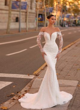 Rochia de mireasă este o creație elegantă și fermecătoare, lungă până în pământ și cu o formă prințesă. Cu un design feminin și romantic, aceasta este realizată dintr-o dantelă maruntă și sclipitoare, care adaugă o notă de glamour. Bretelele subtiri conferă o delicată eleganță, în timp ce manecile tip capac adaugă un strop de mister și sofisticare. Această rochie de mireasă de vis este potrivită pentru o domnișoară care vrea să strălucească în ziua cea mare și să impresioneze cu feminitatea ei rafinată.