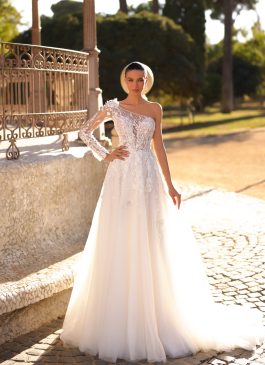 Rochia de mireasă este un vis împlinit, o capodoperă a eleganței și feminității. Lunga și grațioasă, aceasta impresionează prin detaliile sale rafinate. Bustul este decorat cu o dantelă fină, dispusă pe un umăr, care se continuă armonios pe o manecă sofisticată. Delicatețea și complexitatea dantelei se prelungesc cu măiestrie și pe fusta rochiei, oferind un aspect romantic și plin de feminitate. Această rochie de mireasă este creația perfectă pentru o apariție de neuitat în ziua cea mare.