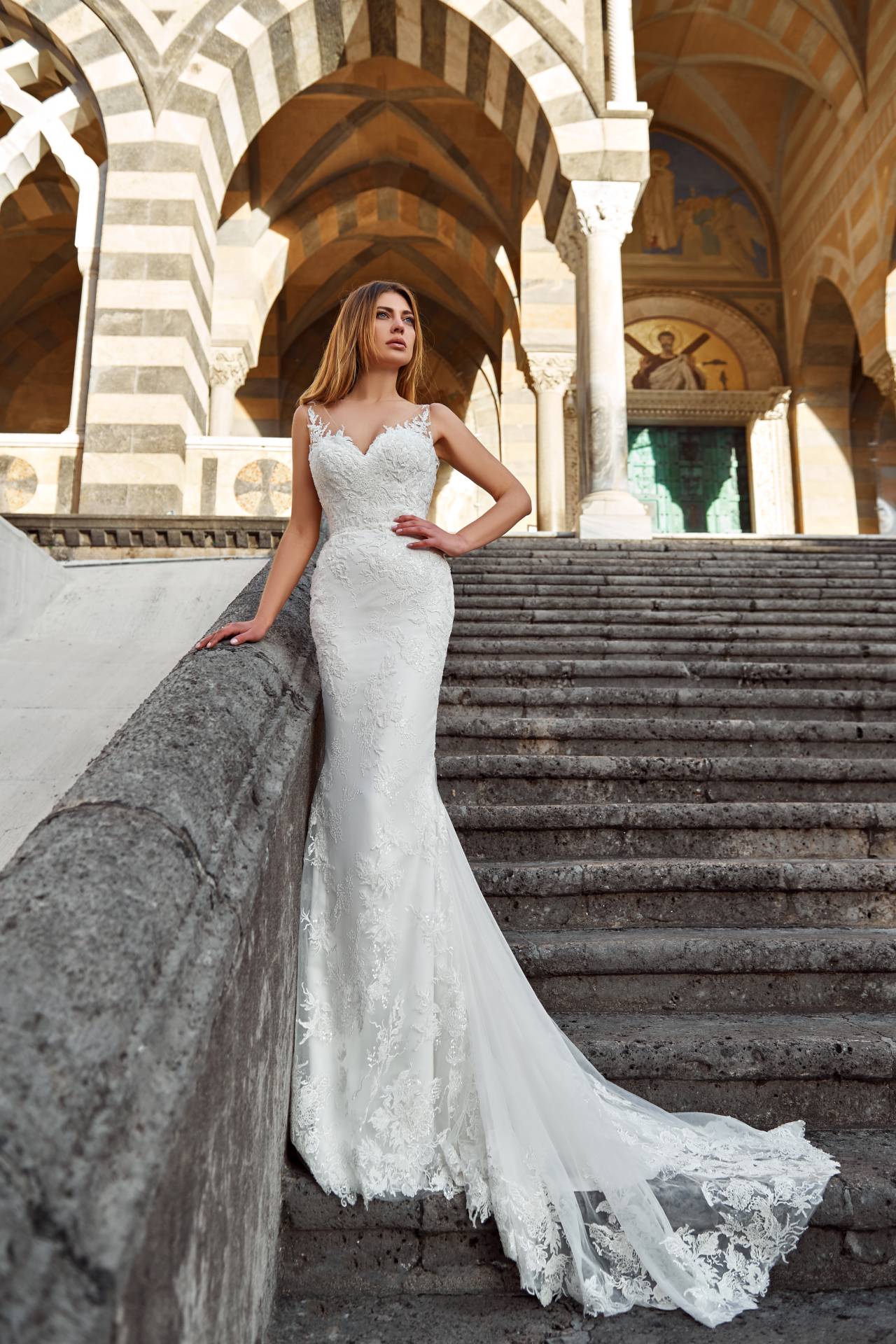 Rochia de mireasa Contursi este o rochie stil sirena care pune in evidenta formele corpului. Dantela speciala cusuta cu margele fine, este aplicata pe intreaga rochie iar clinul din spate creat din tulle frantuzesc este accesorizat pe margine cu dantela fina. Rochia Contursi evoca o finete si o eleganta incantatoare. Spatele in V o completeaza si ii confera o nota de senzualitate.