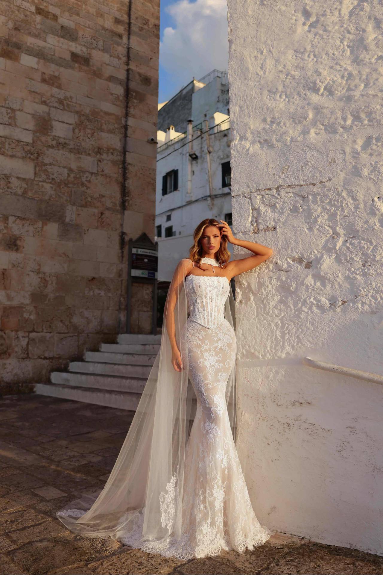Pentru un efect regal, corsetul poate fi combinat cu fusta tip prințesă, care adaugă volum și dramatism, transformând instant ținuta într-o rochie de mireasă prințesă. În plus, capă lungă detașabilă completează perfect look-ul, oferind fluiditate, mișcare și un impact spectaculos în fotografii. Deși fără mâneci clasice, capa creează un efect similar unei rochii de mireasă cu mâneci, adăugând eleganță și rafinament.