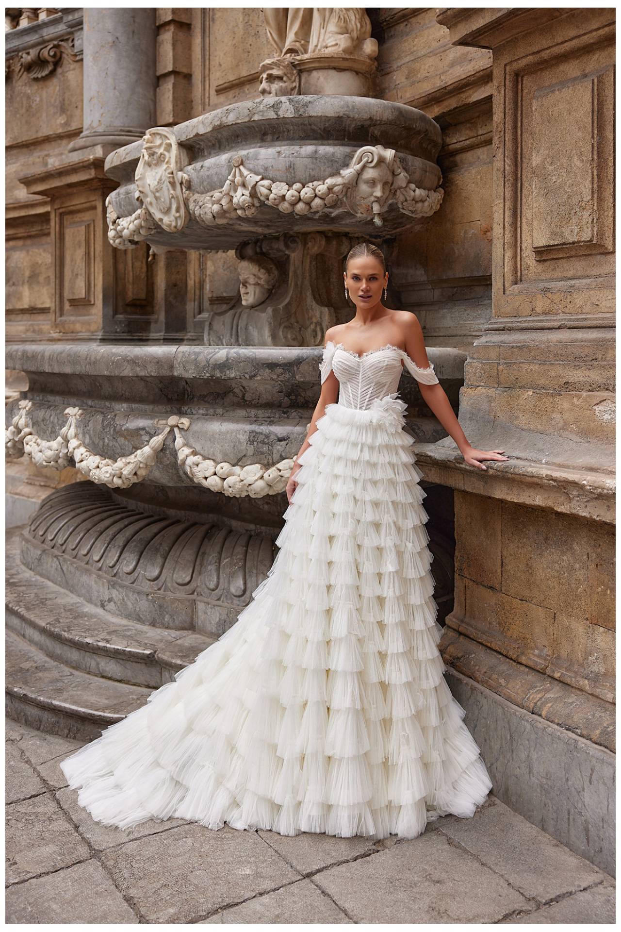 Fusta amplă din tulle franțuzesc, construită în straturi suprapuse și volane aplicate manual, conferă rochiei de mireasă LUNA un volum spectaculos și o mișcare naturală. Croiala tip prințesă avantajează diferite tipuri de siluetă și oferă confort pe tot parcursul evenimentului. Această rochie de mireasă printesa este ideală pentru momentele în care mireasa își dorește o apariție impresionantă, dar ușor de purtat.