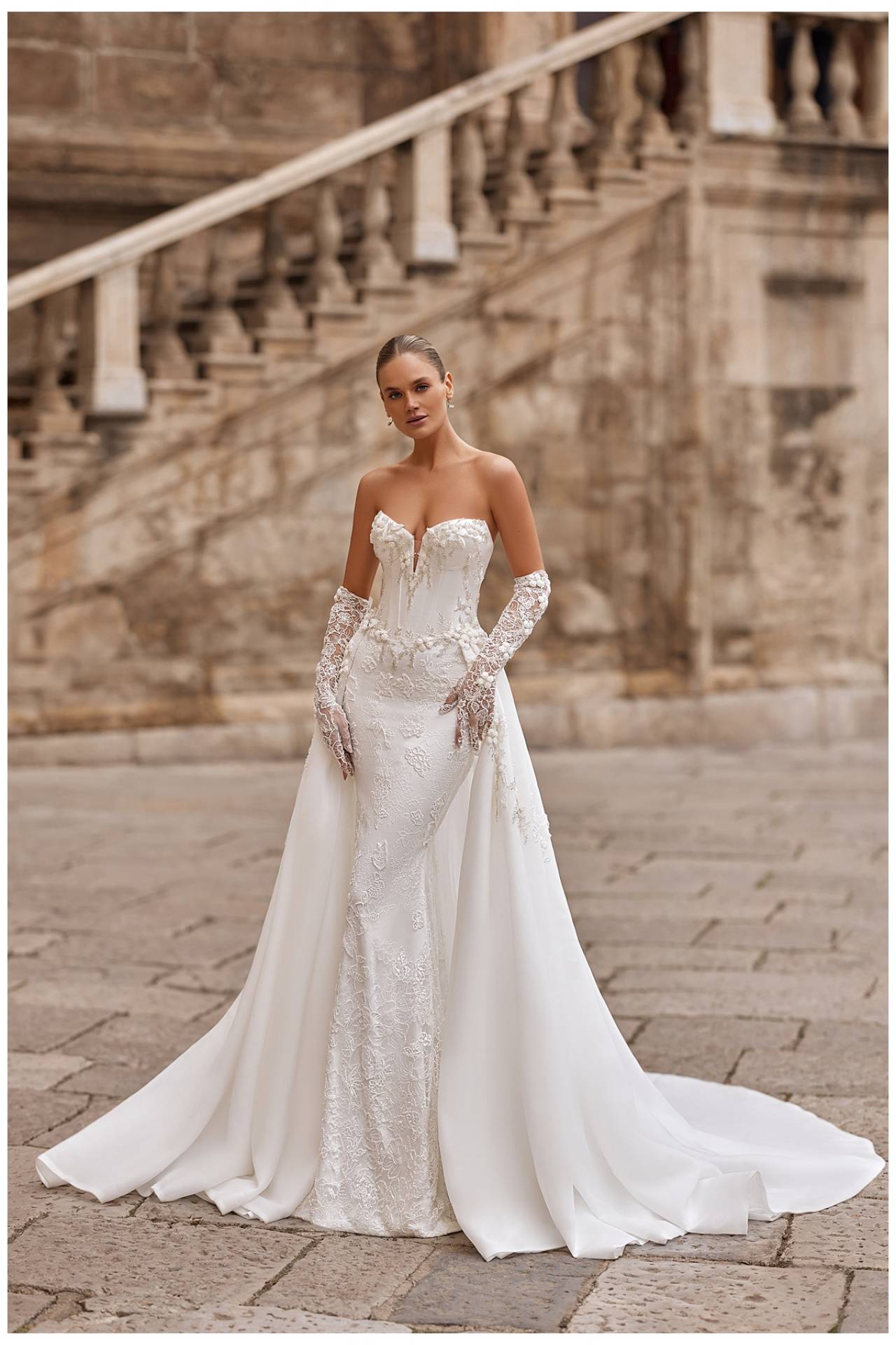 Modelul este compus din rochia tip sirenă, o trenă detașabilă și mănuși din broderie, oferind miresei posibilitatea de a-și transforma apariția de la ceremonie la petrecere. Această abordare modulară face din MARTINA o alegere ideală pentru miresele moderne, care caută o rochie de mireasă complexă, dar ușor de adaptat, fără a renunța la rafinament sau coerență stilistică.