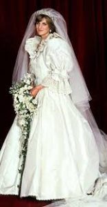 Printesa Diana si Printul Charles si-au unit destinele pe 29 Iulie, 1981 la Catedrala St. Paul din Londra. Catalogata drept ”cel mai bine pastrat secret din istoria modei”, rochia sa de mireasa a purtat semnatura casei de moda David and Elisabeth Emanuel. Designul elaborat a rochiei a presupus aplicarea manuala a peste 10.000 de perle si a inclus o trena lunga de aproape 6 metri!
