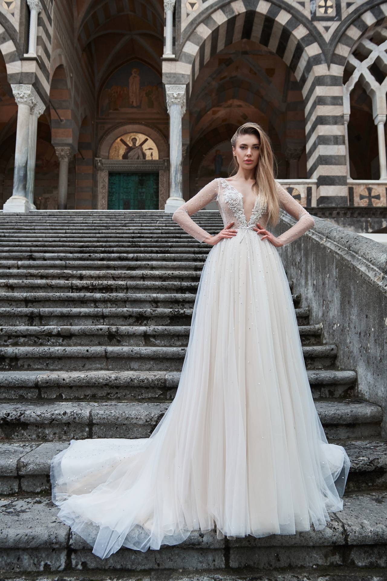 Rochia de mireasa Ravena este speciala prin finetea cristalelor Swarowski si a tulle-ului nude din matase. Presarata cu cristale pe bust si pe fusta, acest model devine rafinat si delicat. Decolteul adanc, atat in fata, cat si in spate, o completeaza si o intregeste ca rochie.
