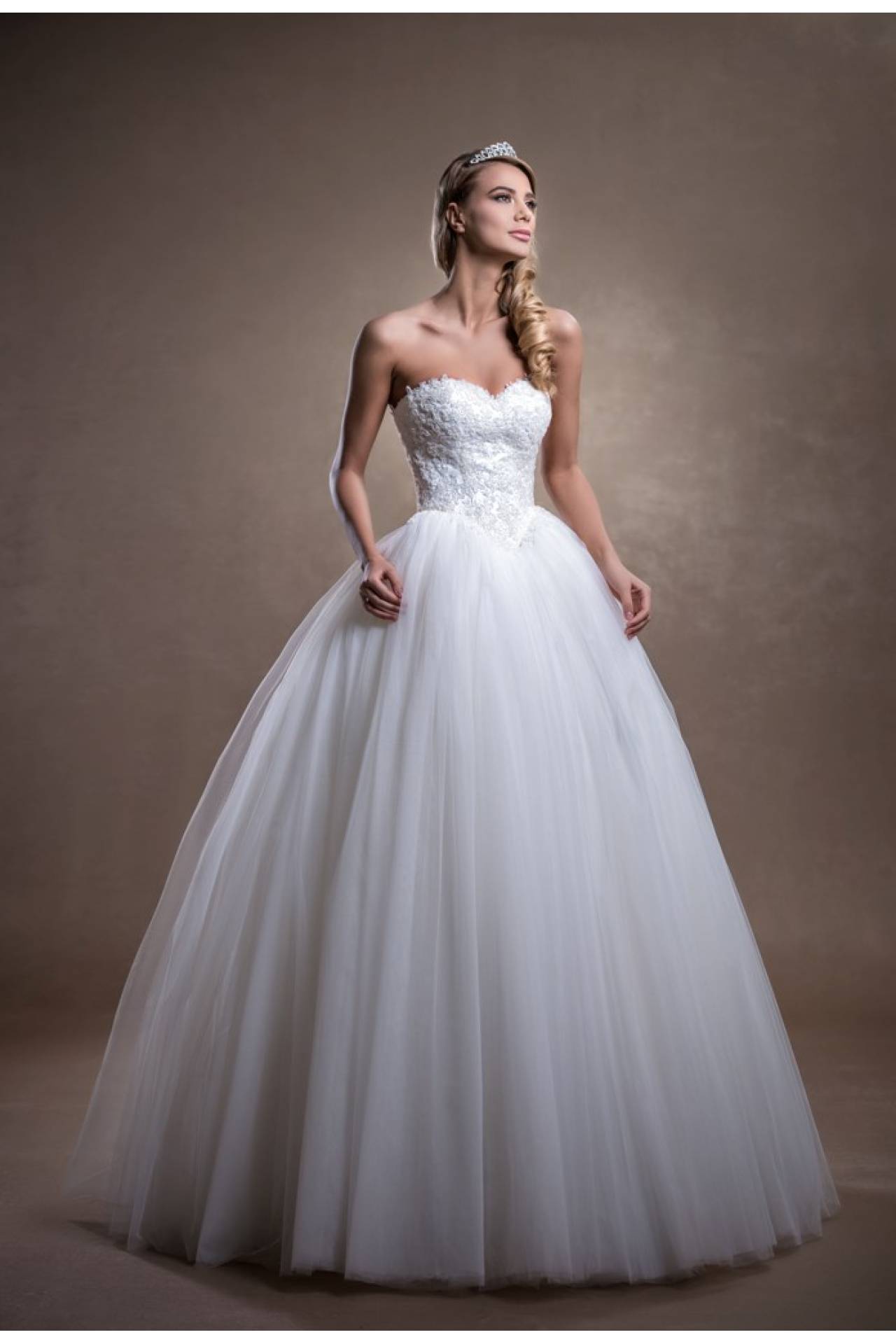Rochie de mireasa printesa cu fusta din tulle si dantela fina cu pietre pe corset.
