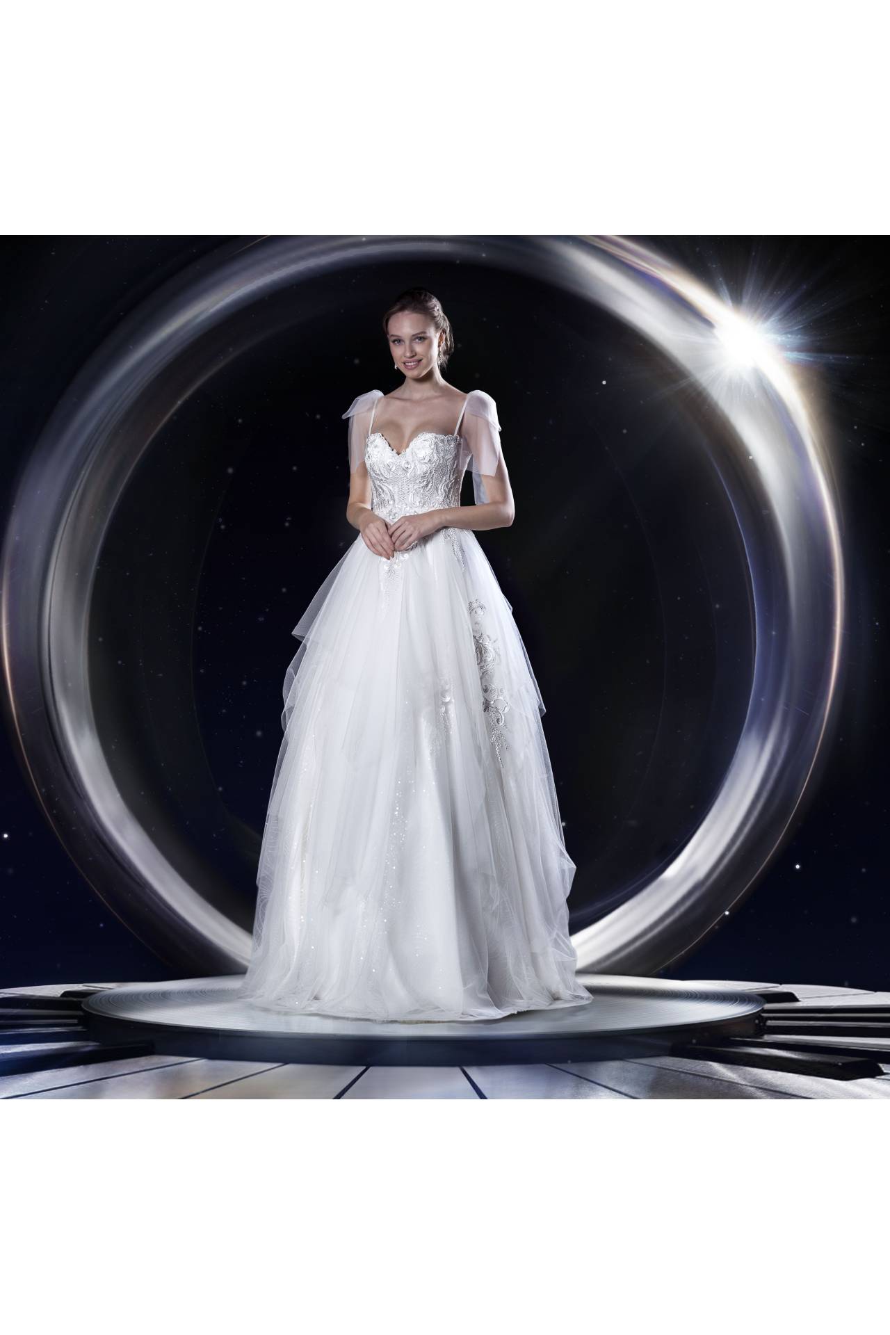 Rochia de mireasa Anastasia este dulce si delicata. Fusta creata din volane confera naturalete iar corsetul cu danteluta este foarte fin. Bretelele cu funde din tülle o asezoneaza intr-un mod delicat.