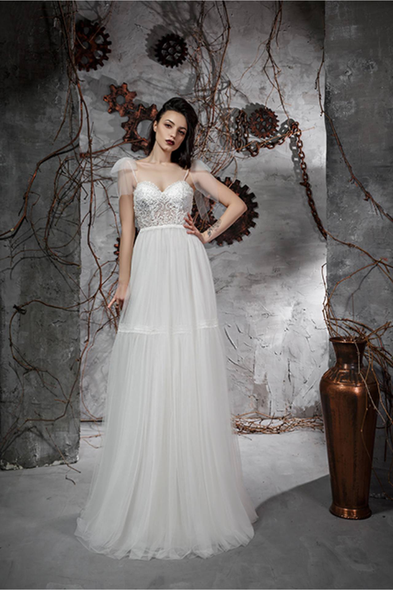Antiope este o rochie de mireasa diferita si incantatoare. Banda de dantela aplicata pe fusta si bretelele cu funde confera rochiei un aspect romantic si noncorformist.