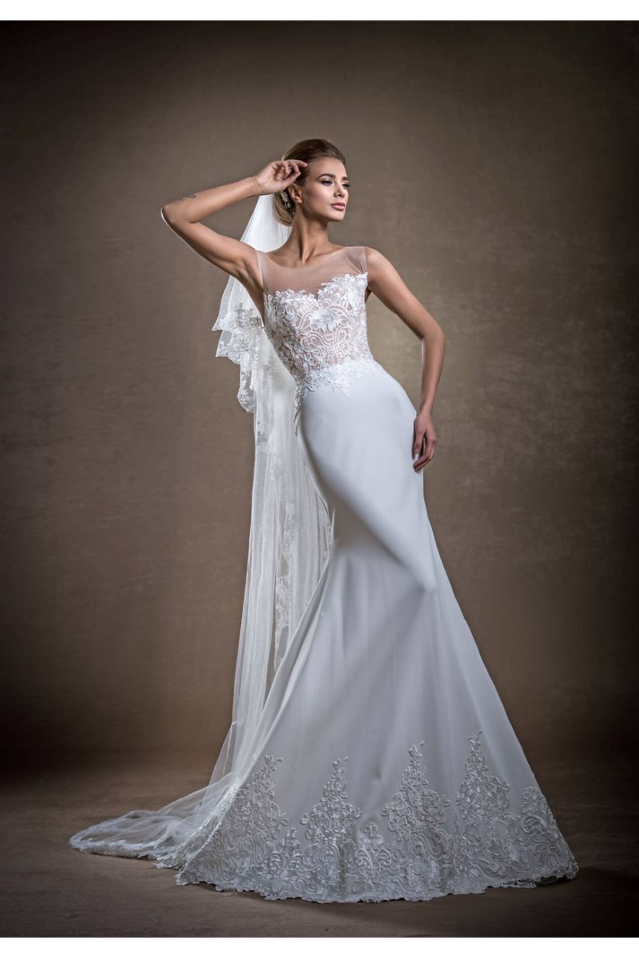 Rochie de mireasa din material elastic matasos si bust semi transparent din dantela cu aplicatii de pietre