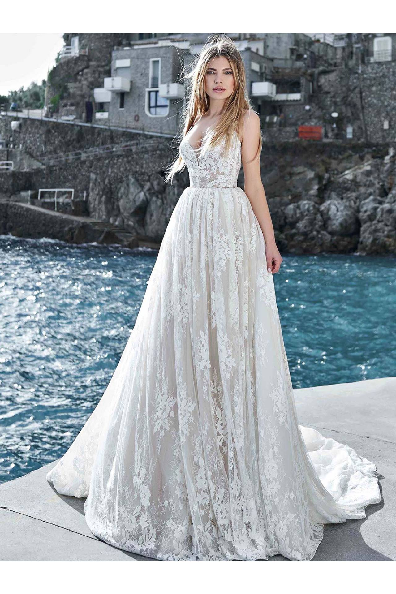 Rochia de mireasa Argenta este creata dintr-o dantela fina chantilly. Este un model in stil printesa care avantajeaza toate tipurile de siluete. Decolteul adanc creat si bretelele subtiri de tip spaghetti, sunt elementele care dau o nota de senzualitate rochiei. Argenta este usoara si foarte practica.