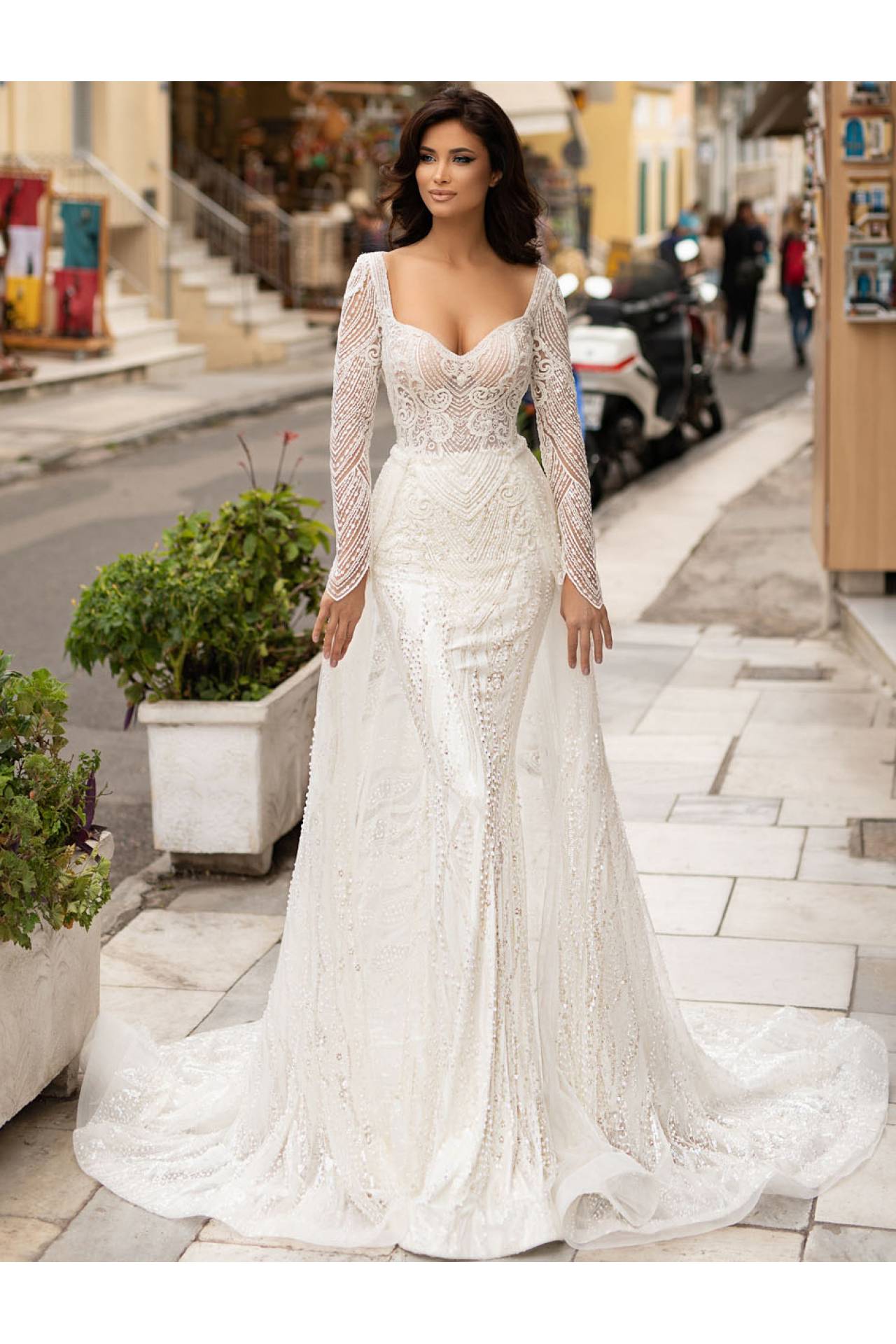 Rochia de mireasa Aruba este deosebit de fina prin combinatia de doua dantele. In partea de sus rochia are o dantela fina cu pietre, iar in partea de jos se continua cu o dantela metraj cu paiete, conferindu-i foarte multa eleganta. Trena detasabila este spectaculoasa prin bogatia dantelei metraj cu paiete.