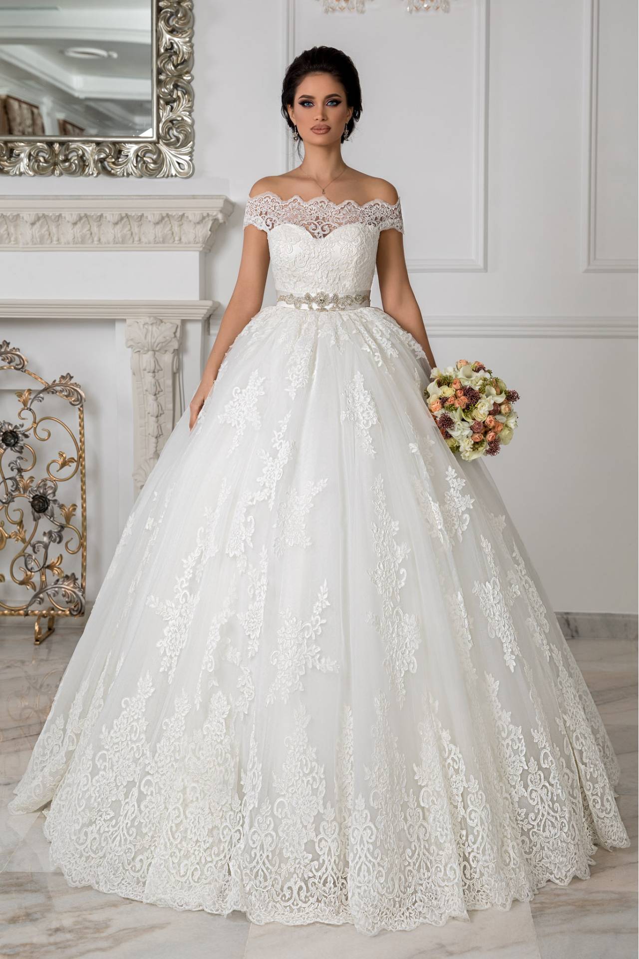 Rochia de mireasa Bluebell este un model printesa care intruchipeaza romantismul si rafinamentul. Bogatia dantelei fine imbraca rochia intr-o feerie de falduri, facand-o regala. Forma de barcuta ii confera rochiei o nota de rafinament iar centura din talie este detaliul care o completeaza.