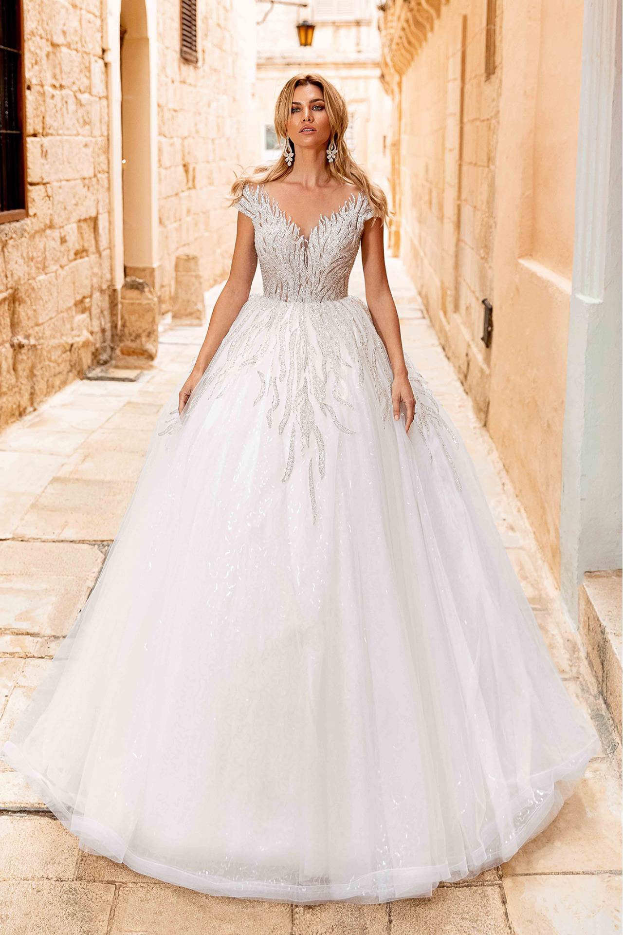 Rochie de mireasa Canberra impresioneaza prin formele de flacari ale dantelei. Nuanta usor argintie a acesteia face un contrast placut cu tulleul cu paiete aplicat pe fusta rochiei. Manecile putin cazute si decolteul in forma de V format de aceste flacari ale dantelei, ii confera rochiei un aer de printesa moderna si sofisticata.