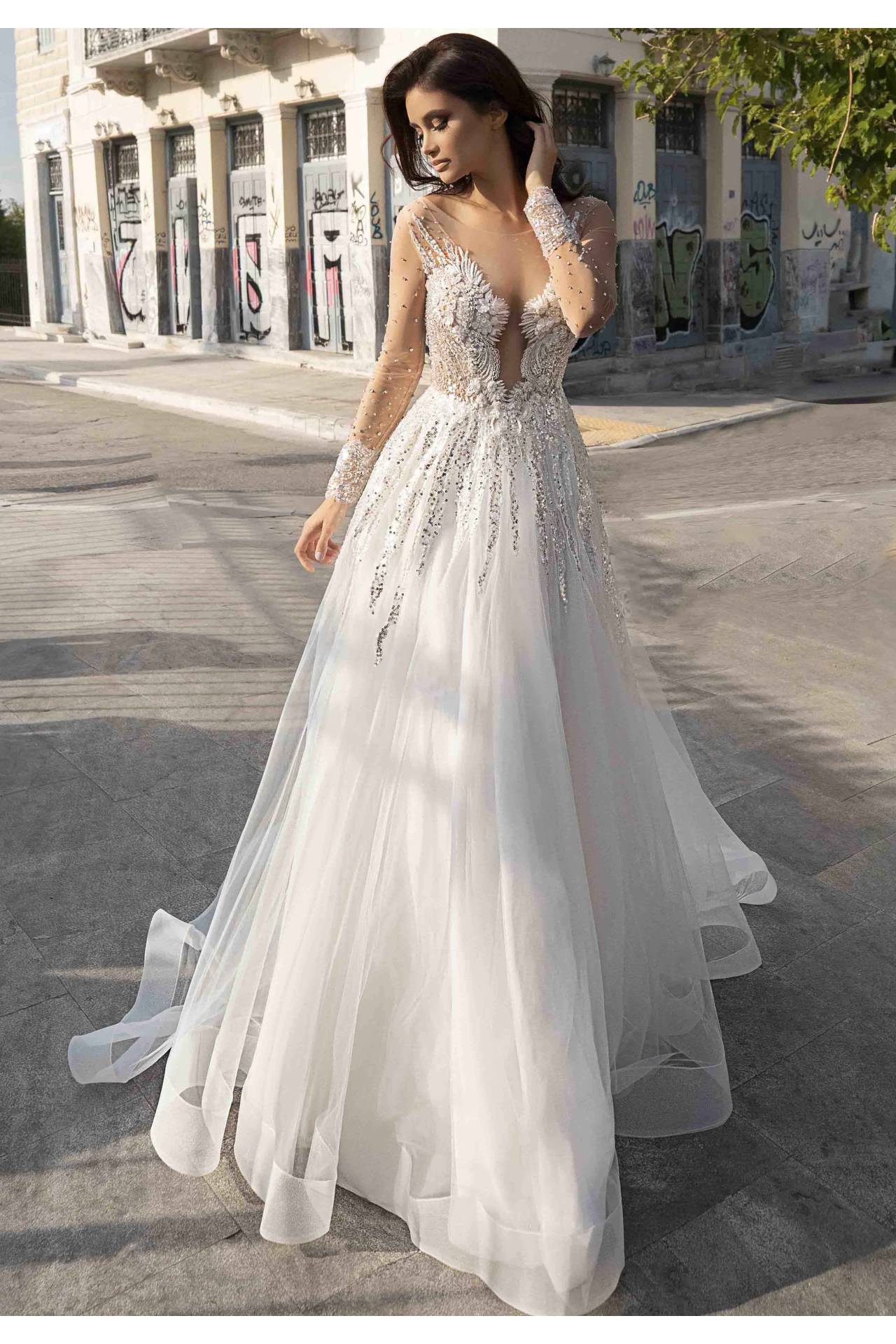 Rochia de mireasa Formentera este croita in stil A si exprima finete si eleganta. Materialul cu paiete aplicat, atat pe corset, cat si pe fusta da senzatia de alungire si inaltare. Aplicatiile 3D de la decolteu o decoreaza si o completeaza evidentiind o rochie spectaculoasa si deosebita. Tulle-ul cu pietre swarosvsky aplicat pe maneci ii confera sclipire si delicatete.