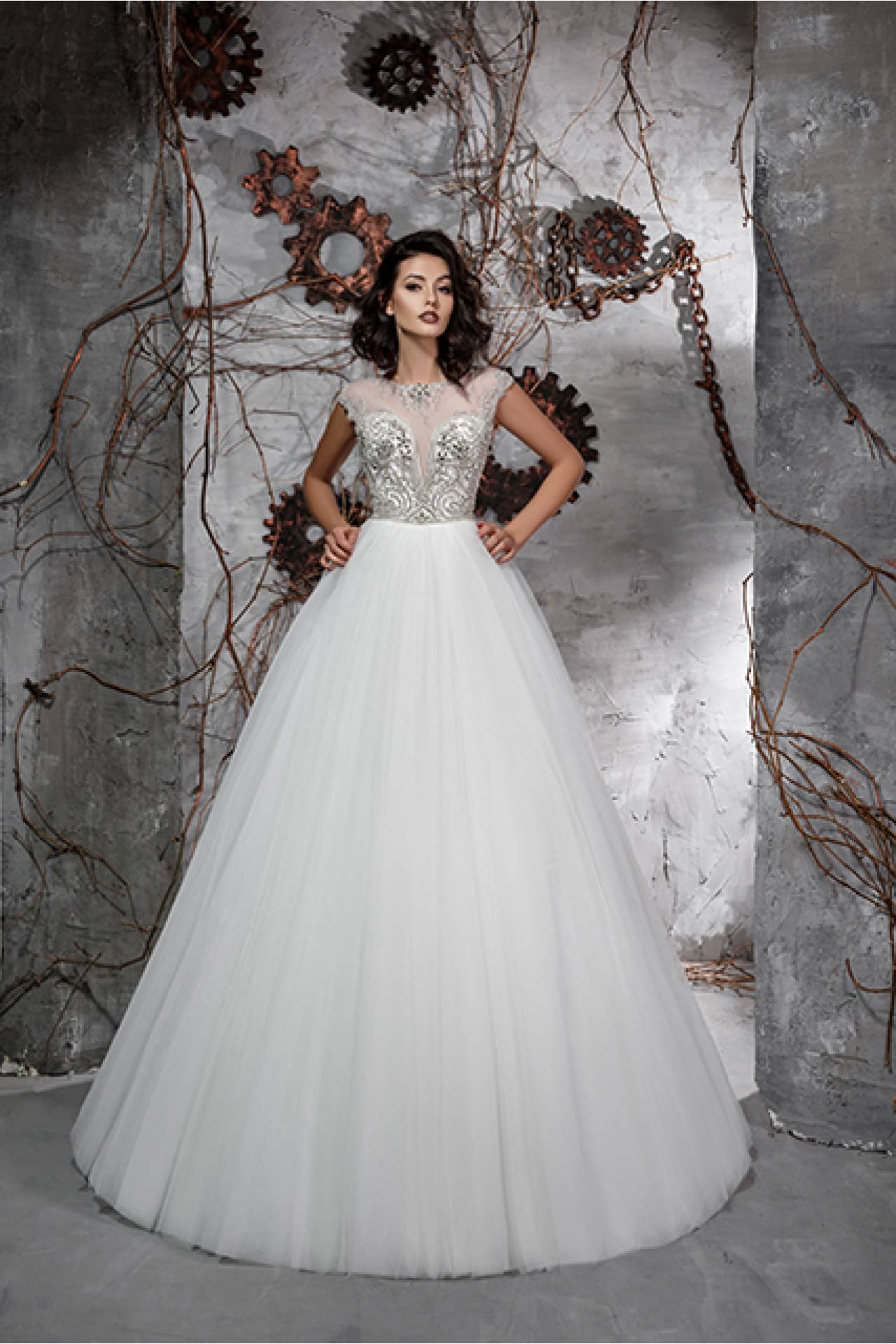 Corsetul accesorizat cu pietre fine si strasuri contrasteaza cu fusta extraordinara de printesa. Rochia de mireasa Gemini pune in evidenta feminitatea si frumusetea miresei.
