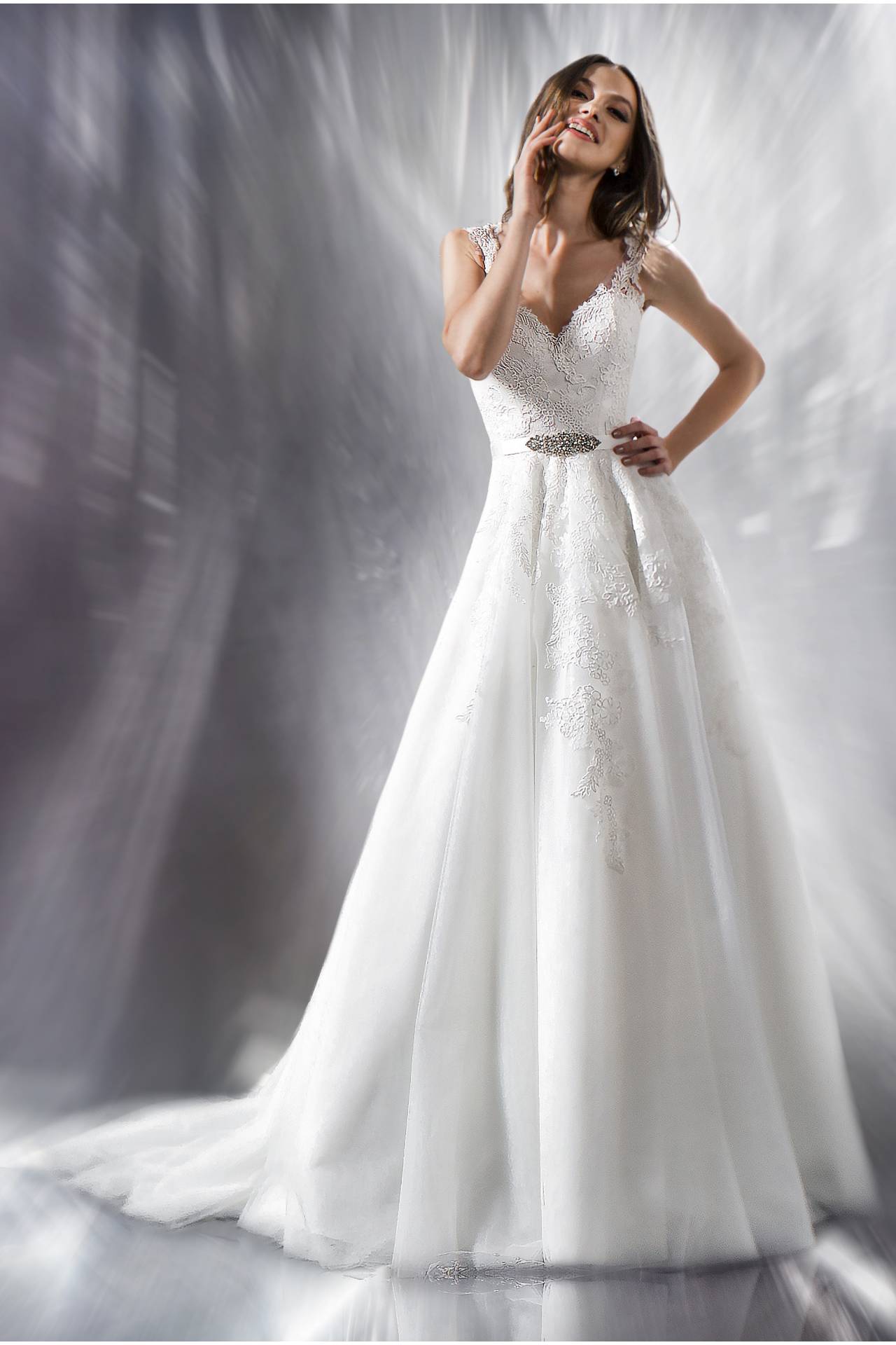 Clasica forma de A nu va da gres niciodata. Rochia de mireasa Glamour denota simplitate si eleganta tocmai prin linia simpla a croiului. Dantela fina, translucida, de pe intreaga rochie transmite delicatete.