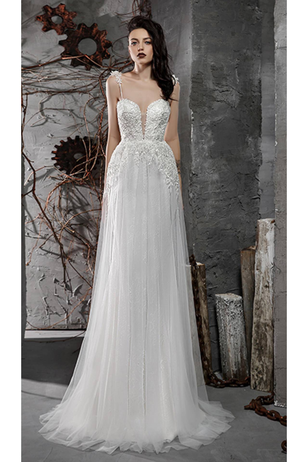 Rochia de mireasa Kalypso este diafana si incantatoare prin combinatia de dantela si tulle din matase. Bretelele fine si delicate intampina decolteul adanc si senzual.