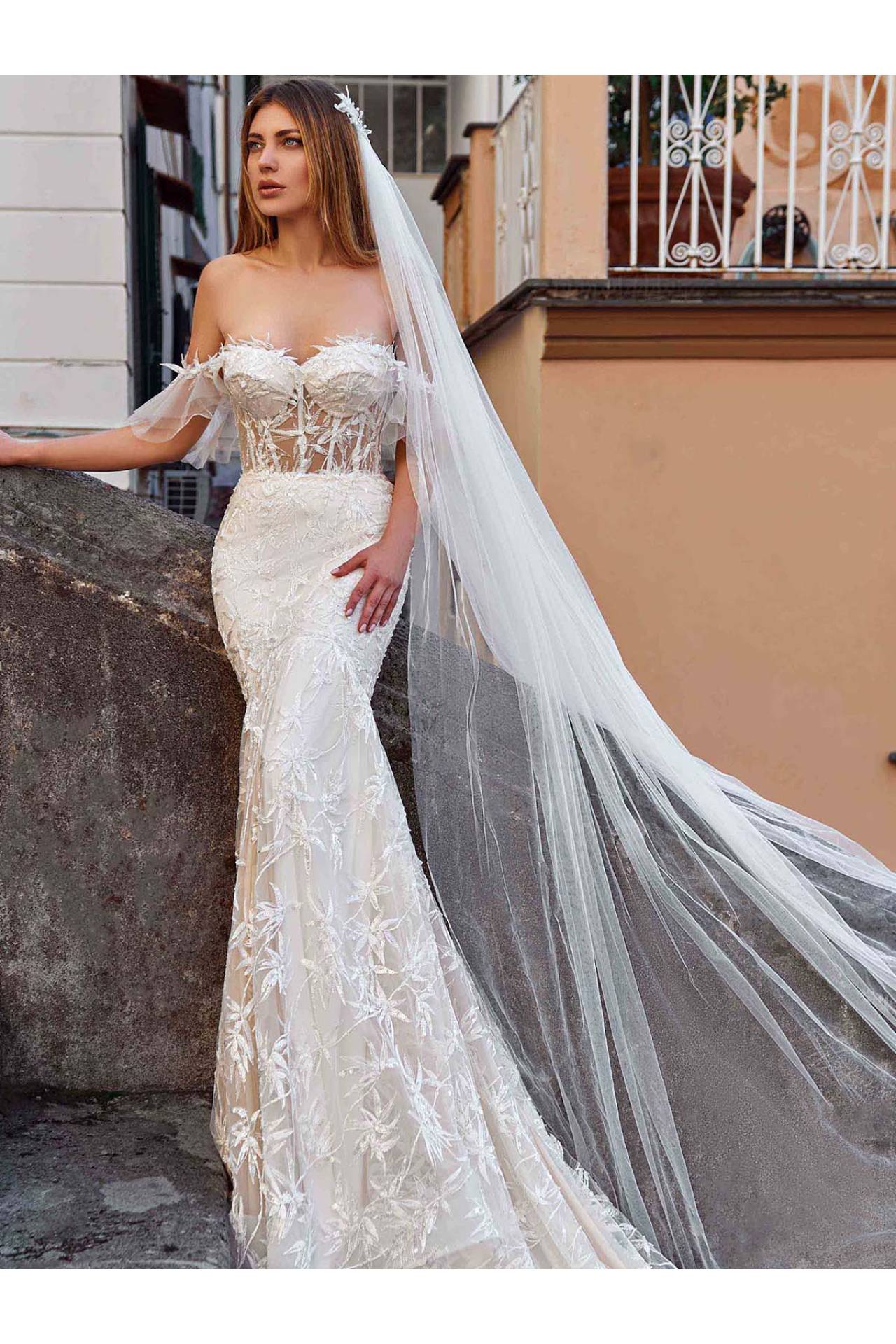 Rochia de mireasa San Fele este un model care straluceste prin forma dantelei de frunze delicate pe care sunt cusute margele si pietre. Croita in stil sirena, San Fele este o rochie angelica si delicata. Manecile cazute cu mici volane constituie elemente care completeaza forma fina a rochiei.