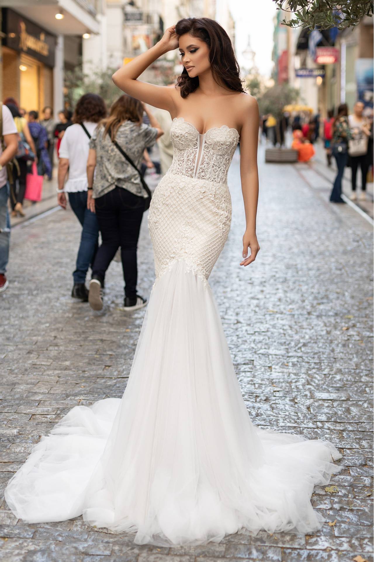 Rochia de mireasa Zanzibar este delicata si fina. Fusta simpla din tulle frantuzesc contrasteaza cu corsetul accesorizat cu dantela fina. Cupele in stil balconete sunt conturate fin punand in evidenta bustul. Rochia Zanzibar este dotata cu o trena lunga si usoara. Rochia de mireasa Zanzibar face parte din categoria rochii de mireasa sirena.