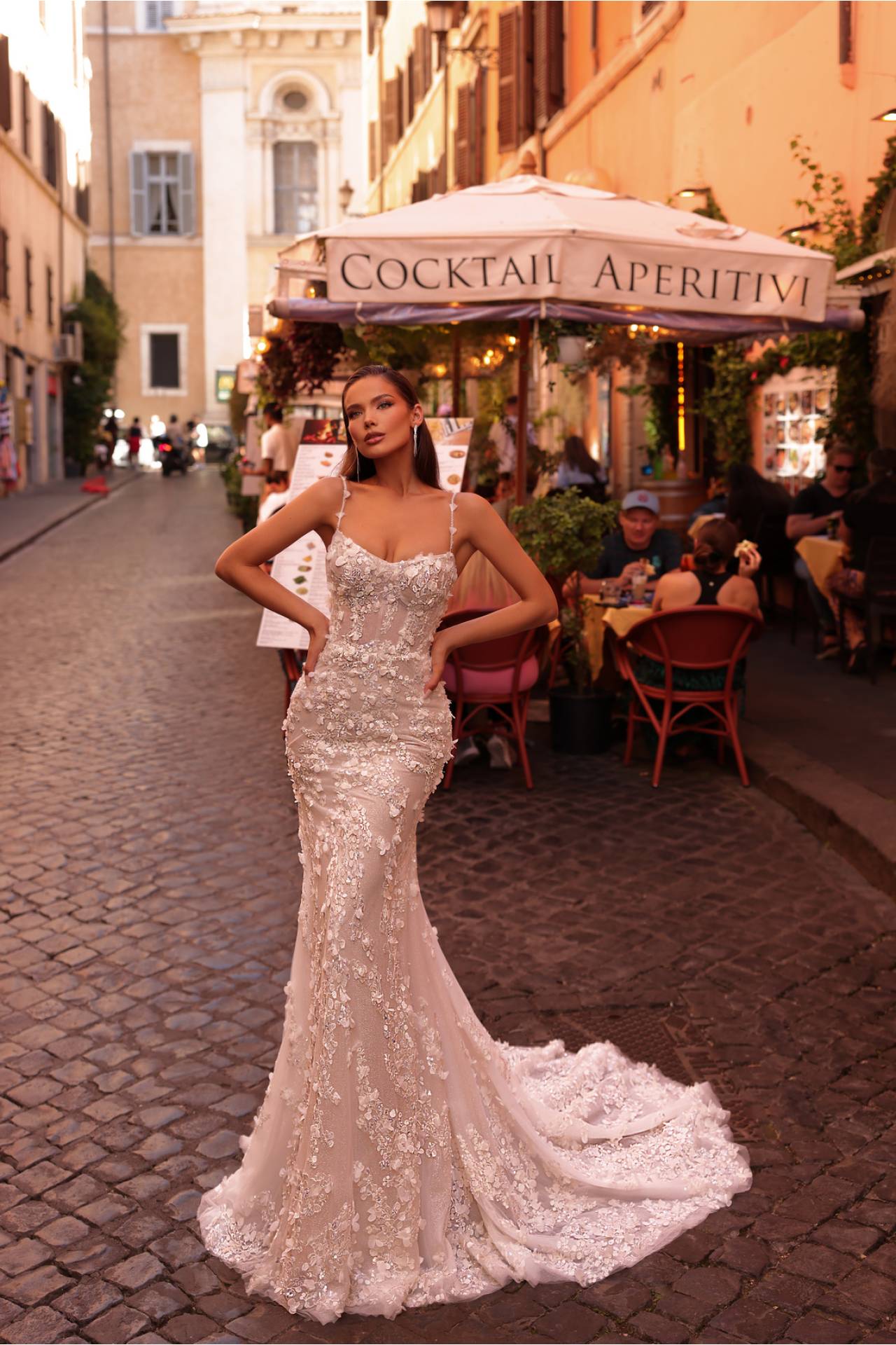 Rochia de mireasă ADDISON este alegerea miresei care își dorește să strălucească și să transforme fiecare pas într-un moment de neuitat. Este o rochie de mireasă sirenă cu bretele, creată pentru o nuntă cu stil, pasiune și personalitate, în care eleganța clasică se îmbină perfect cu senzualitatea contemporană și rafinamentul absolut.
