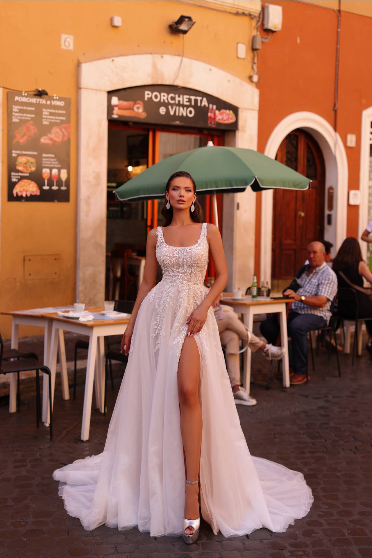 Crăpătura este discret integrată în design, oferind libertate de mișcare și un accent modern, ideal pentru mireasa care își dorește un plus de personalitate și stil.