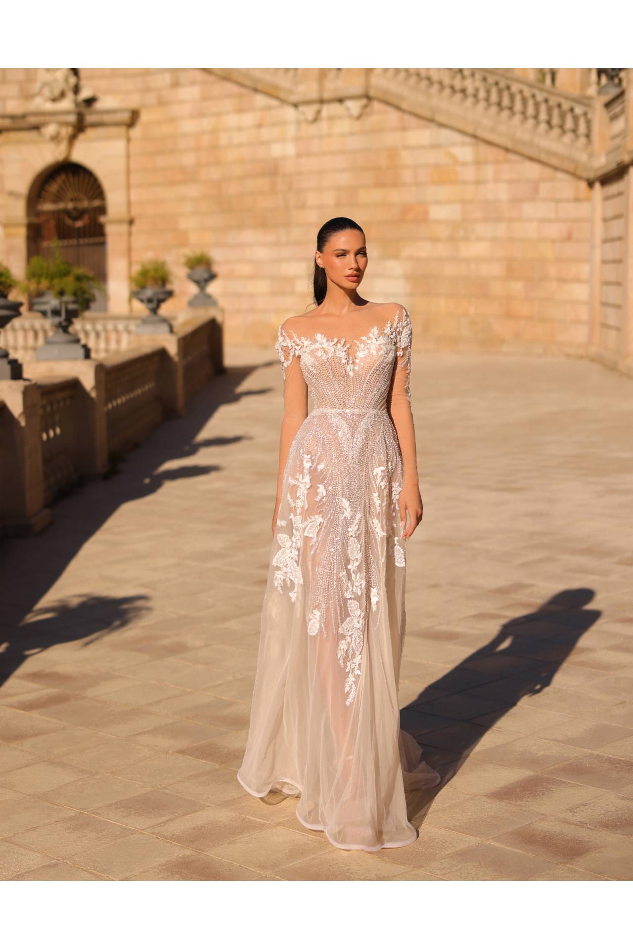 Mânecile lungi conferă rochiei un aspect sofisticat și o fac potrivită inclusiv pentru ceremonii formale sau religioase. Transparența subtilă păstrează lejeritatea ținutei și adaugă un plus de rafinament, transformând această rochie de mireasă într-o alegere elegantă și sigură.