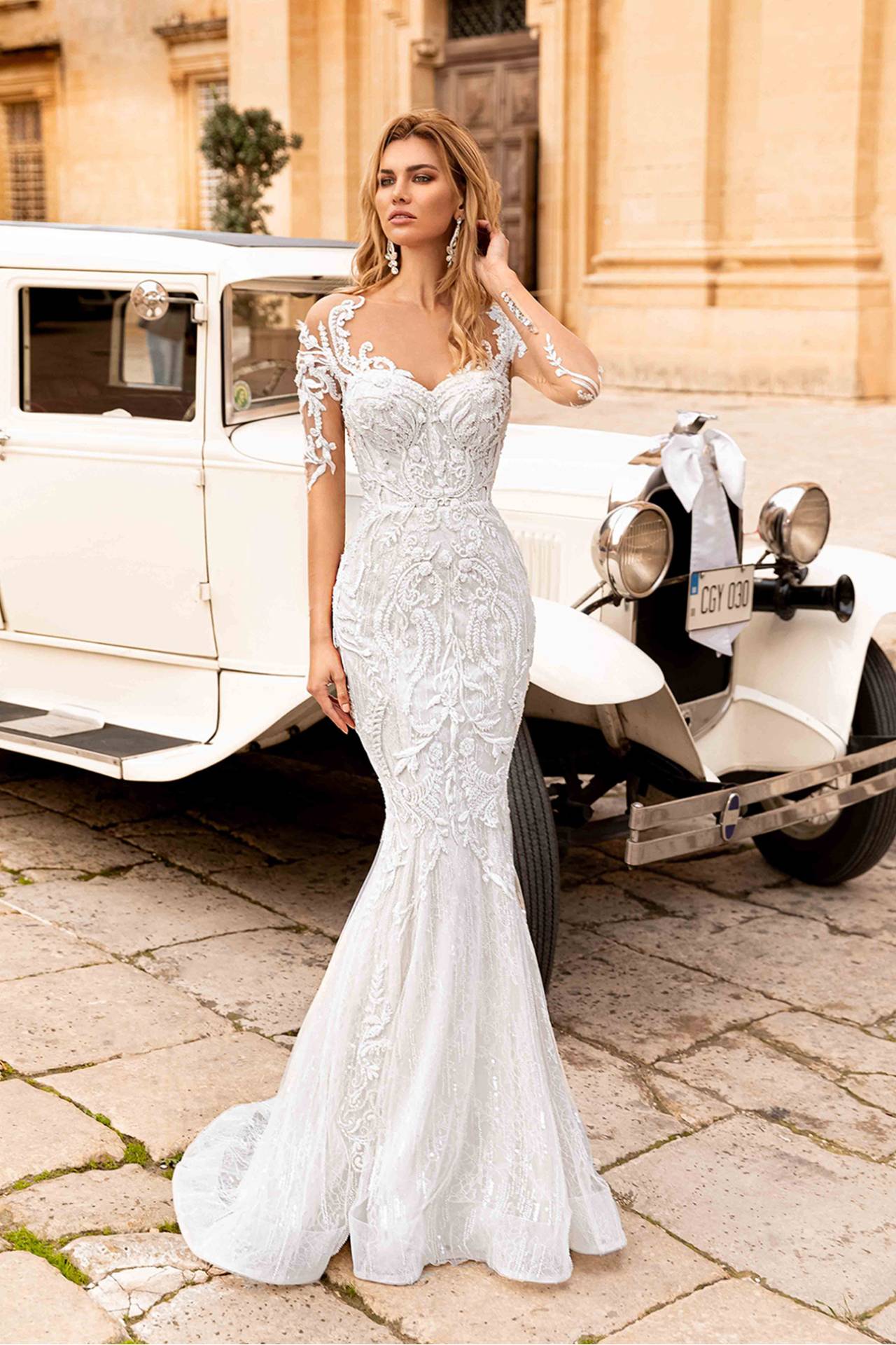 Rochia de mireasa Almeria este o rochie tip sirena care impresioneaza prin combinatia de dantela fina si tulle cu margele. Romantismul rochiei Almeria se regaseste in detaliile florale ale dantelei, care este aplicata intr-un mod unic pe bust si maneci. Rochia se poate purta si cu o trena detasabila ampla si lunga din tiul frantuzesc conferindu-i o alura de printesa.