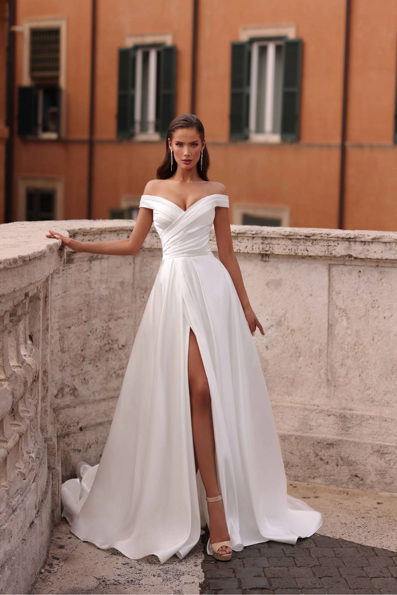 Bustiul rochiei ARDEN este pus în valoare de un decolteu off-shoulder romantic, care evidențiază elegant linia umerilor și a bustului. Drapajele fine sunt atent realizate pentru a contura delicat partea superioară, adăugând un aer sofisticat și extrem de feminin. Acest tip de decolteu creează un echilibru perfect între senzualitate și rafinament, fiind potrivit pentru miresele care își doresc o apariție elegantă, dar expresivă.