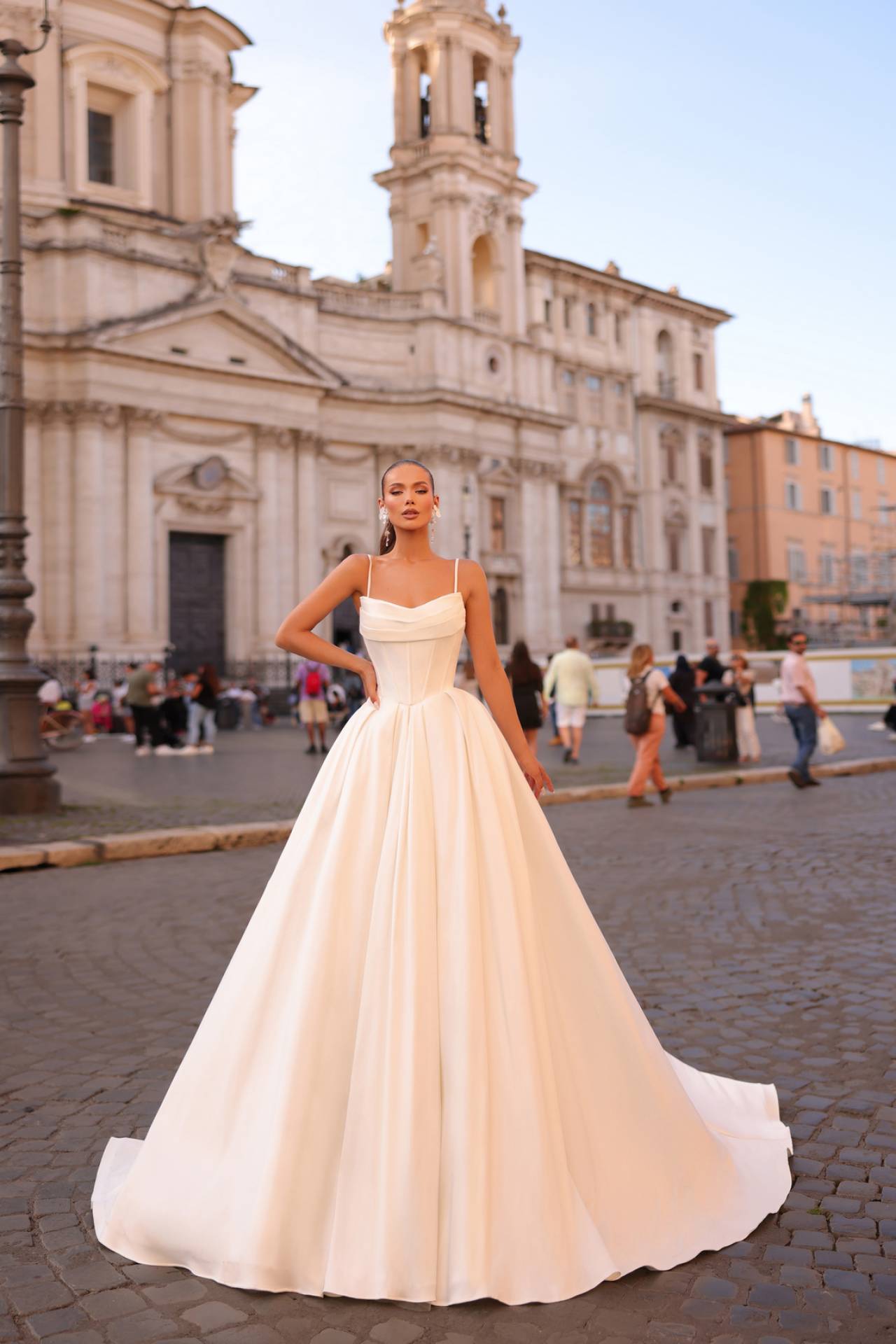 Rochia de mireasă AUTUMN este expresia pură a eleganței clasice, reinterpretată într-o notă modernă și rafinată, creată pentru mireasa care apreciază liniile curate, proporțiile impecabile și frumusețea atemporală. Această rochie de mireasă prințesă impresionează prin simplitatea sa nobilă și prin construcția echilibrată a siluetei, oferind o apariție regală, sigură și memorabilă. AUTUMN este dedicată miresei care știe că adevărata eleganță nu are nevoie de artificii pentru a străluci.