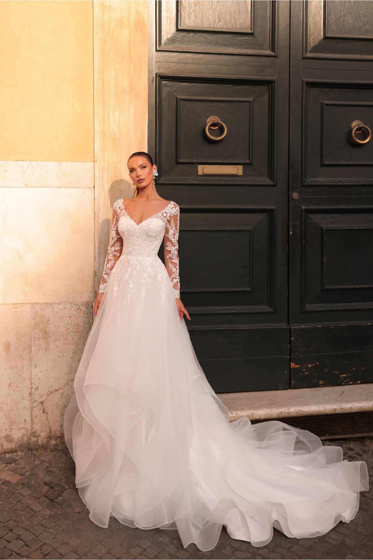Un element definitoriu al acestei rochii de mireasă cu mâneci îl reprezintă mânecile lungi, realizate din material transparent și decorate cu aceleași aplicații florale din dantelă. Acestea creează un efect de continuitate între bust și brațe, adăugând un aer nobil și extrem de feminin. Transparența subtilă păstrează lejeritatea designului, oferind în același timp eleganță și rafinament.