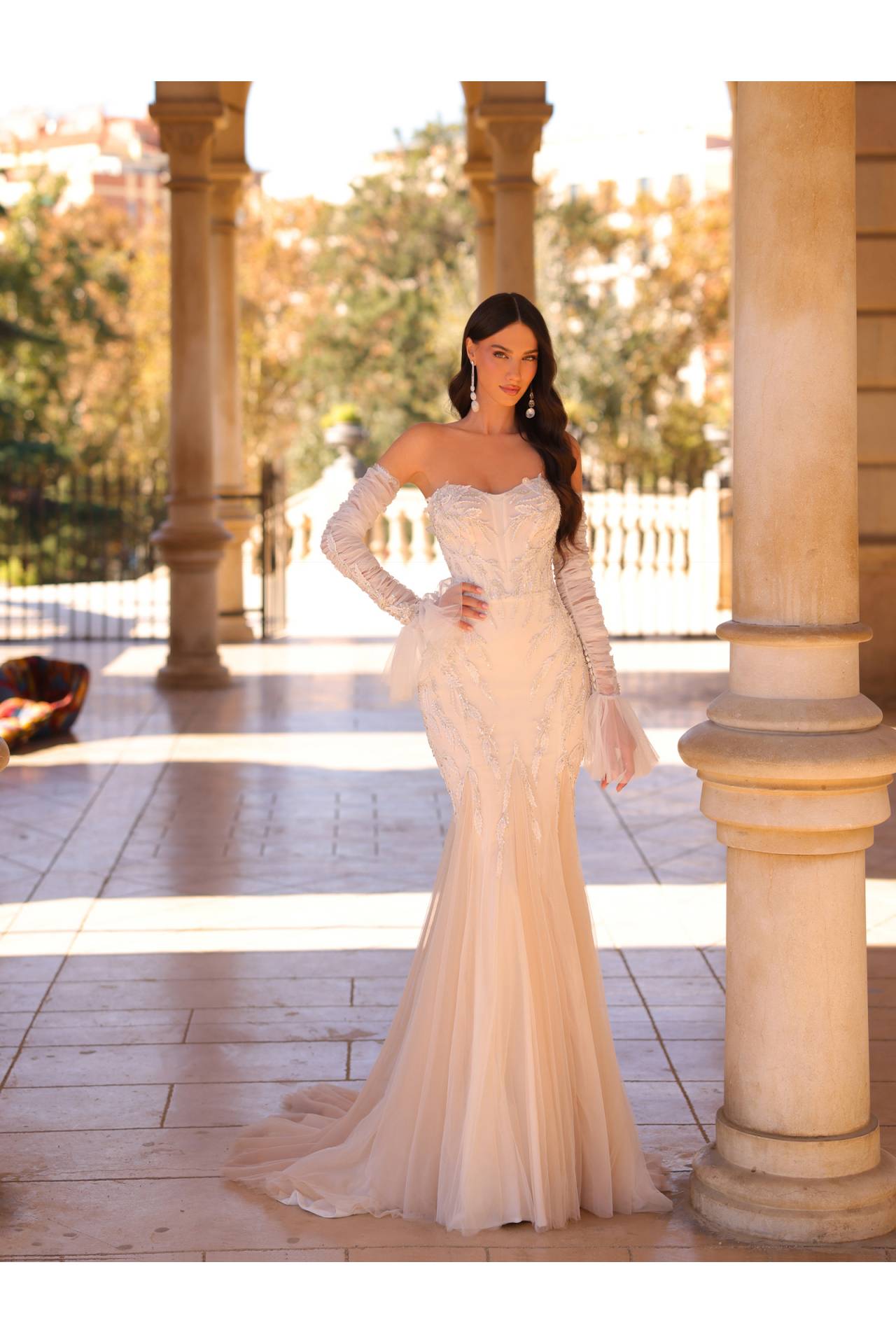 Croiala tip sirenă urmărește delicat linia corpului, evidențiind formele naturale ale miresei, iar fusta ușor evazată adaugă lejeritate și mișcare la fiecare pas. Acest echilibru între structură și fluiditate creează o apariție grațioasă și elegantă, ideală pentru o rochie de mireasă sirenă cu impact vizual.