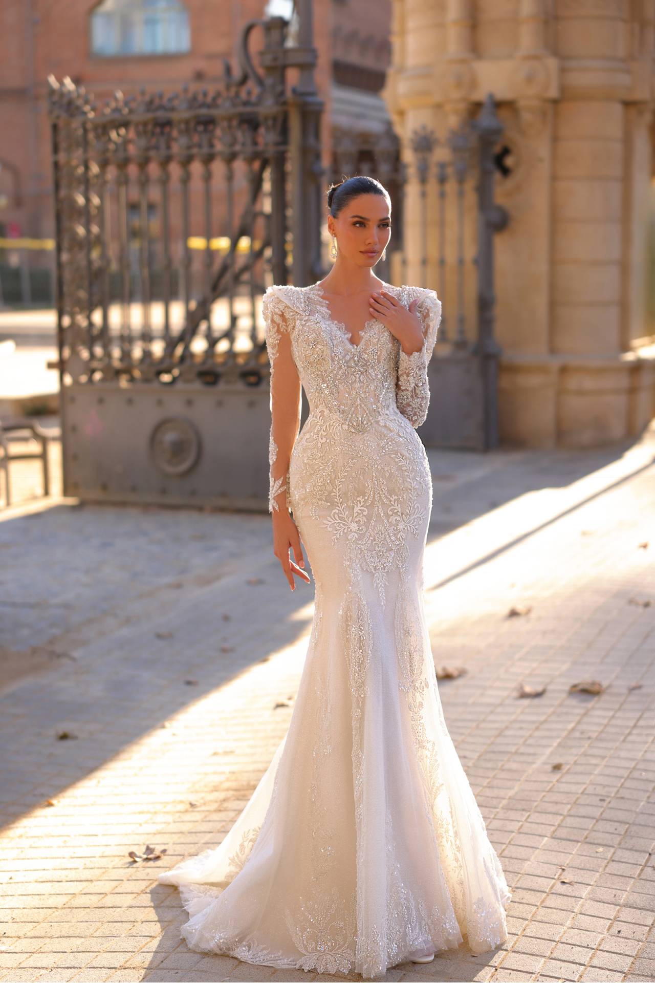 Rochie de mireasă GERALDINE – rochie de mireasă sirenă din dantelă sclipitoare, cu mâneci lungi și epoleti