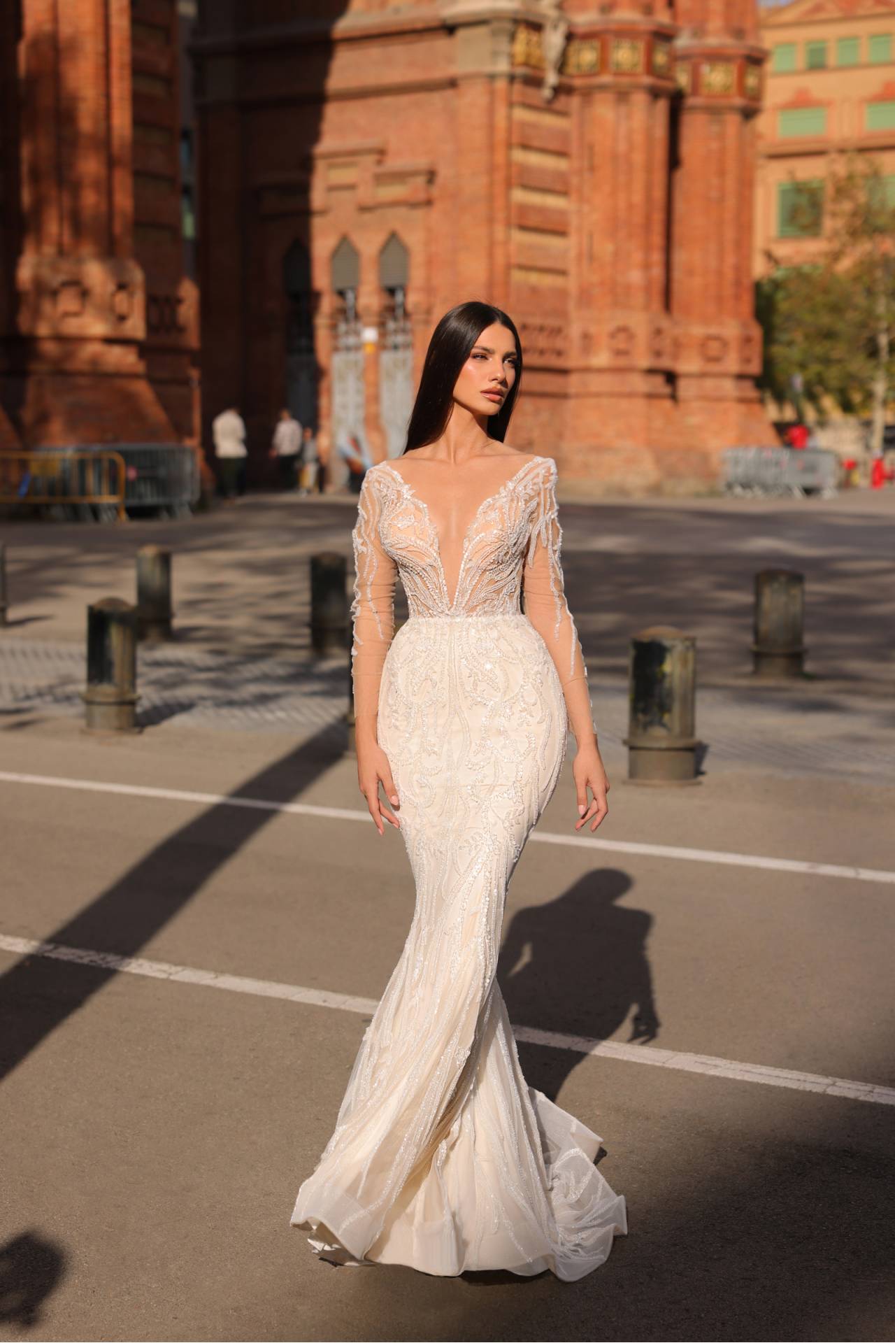 Rochie de mireasă GLOW – rochie de mireasă sirenă din dantelă, cu mâneci lungi și accente glamour