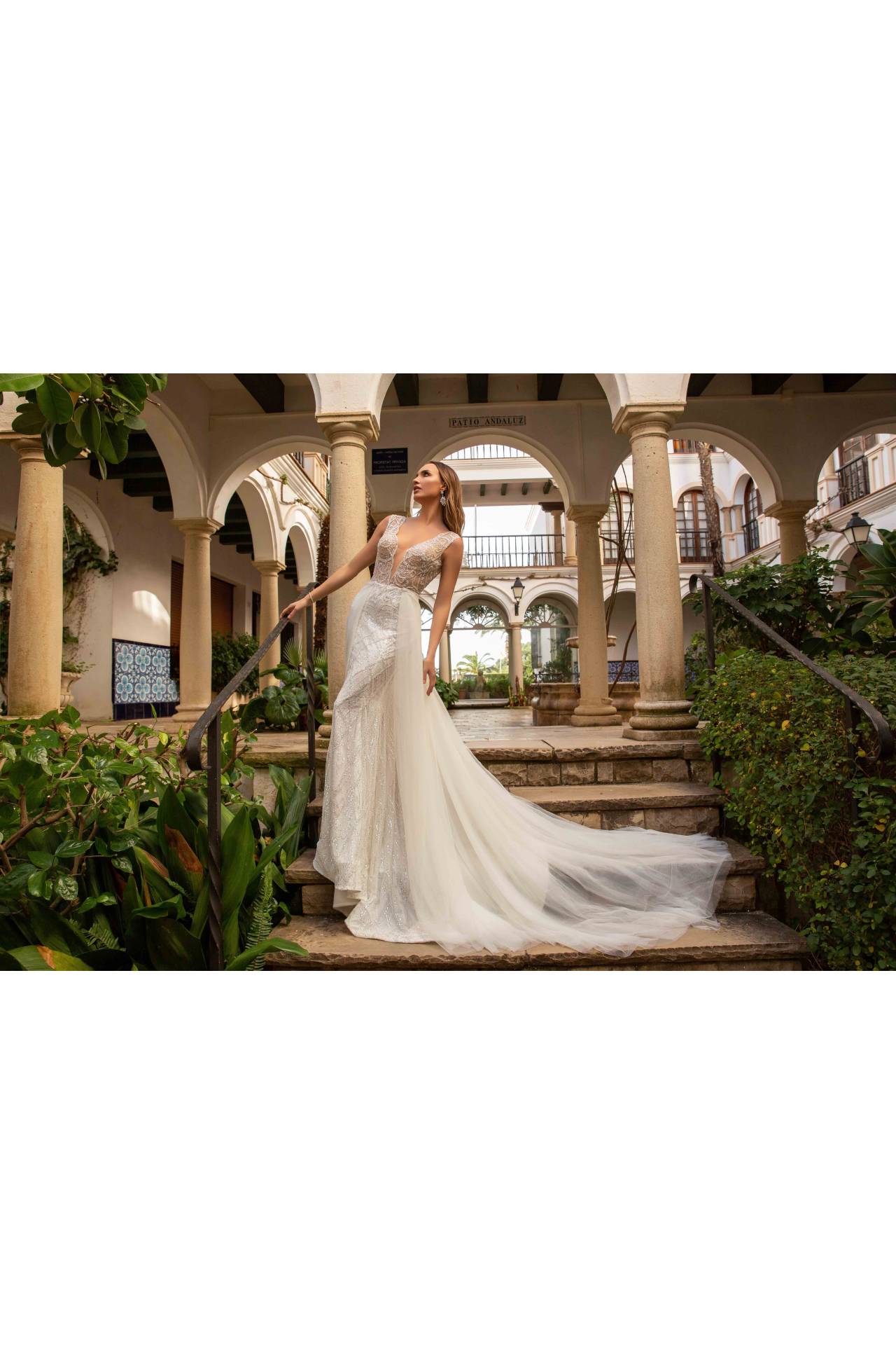 Rochia de mireasa Leiria este sublima si rafinata prin dantela speciala cu aplicatii de pietre si paiete delicate. Spatele cu decupaj adanc si trena lunga detasabila din tiul frantezesc o completeaza si o desavarsesc. Trena detasabila nu este inclusa in pretul rochiei si costa 1000 lei.