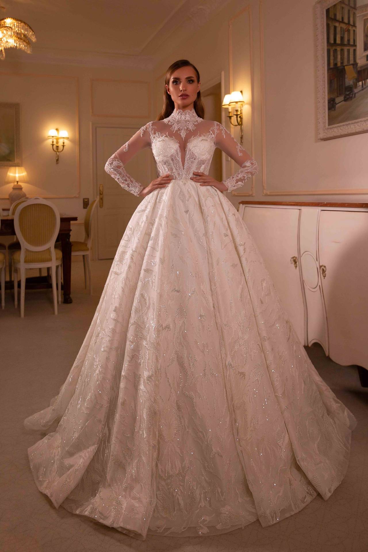 Rochia de mireasa Monserrat este un model printesa spectaculos si regal. Realizata cu un corset care pune talia in evidenta, cu maneci lungi si o fusta ampla si spectaculoasa, accentuata de dantela minunata cu pietre si paiete ii confera un aer imperial.