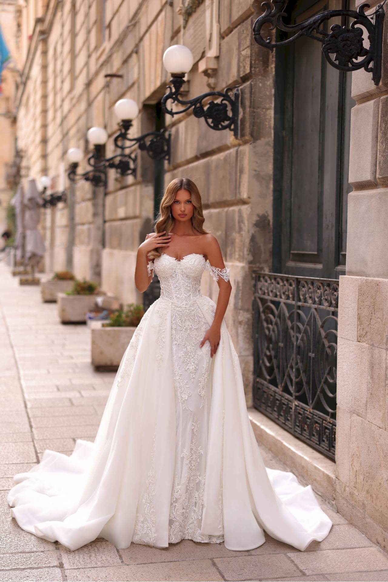 Un element definitoriu al modelului MORGAN este trena detașabilă, care poate fi adăugată opțional pentru ceremonie. Aceasta oferă volum, dramatism și o prezență regală, transformând instant rochia de mireasă într-o apariție spectaculoasă. După ceremonie, trena poate fi îndepărtată cu ușurință, permițând miresei să se bucure de libertate de mișcare pe ringul de dans.