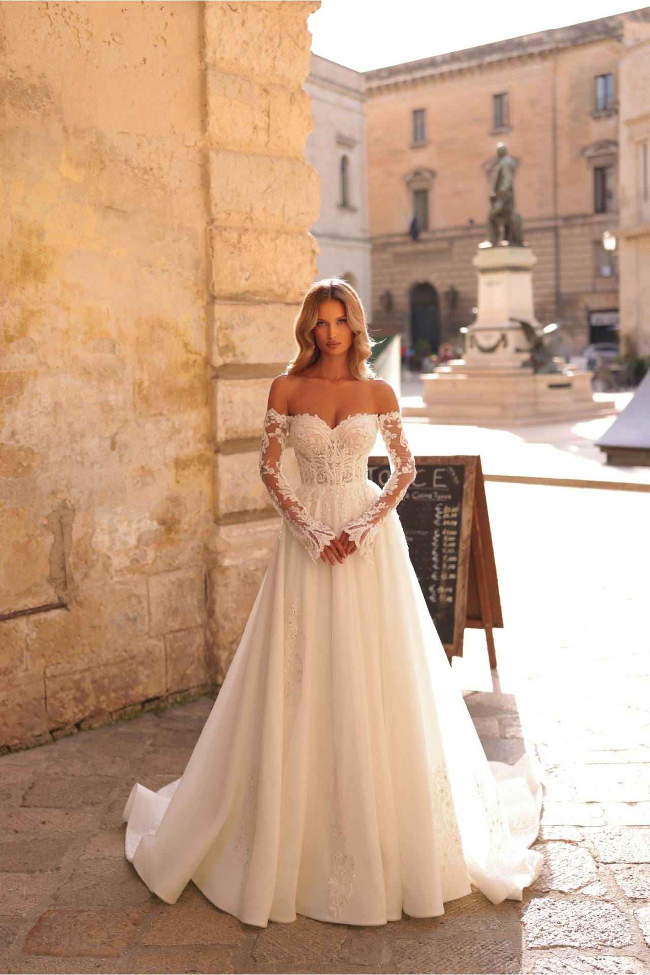 Dantela aplicată discret pe mâneci adaugă profunzime vizuală și completează armonios textura fină a tulle-ului. Această rochie de mireasă cu mâneci oferă un echilibru perfect între funcționalitate și estetică.