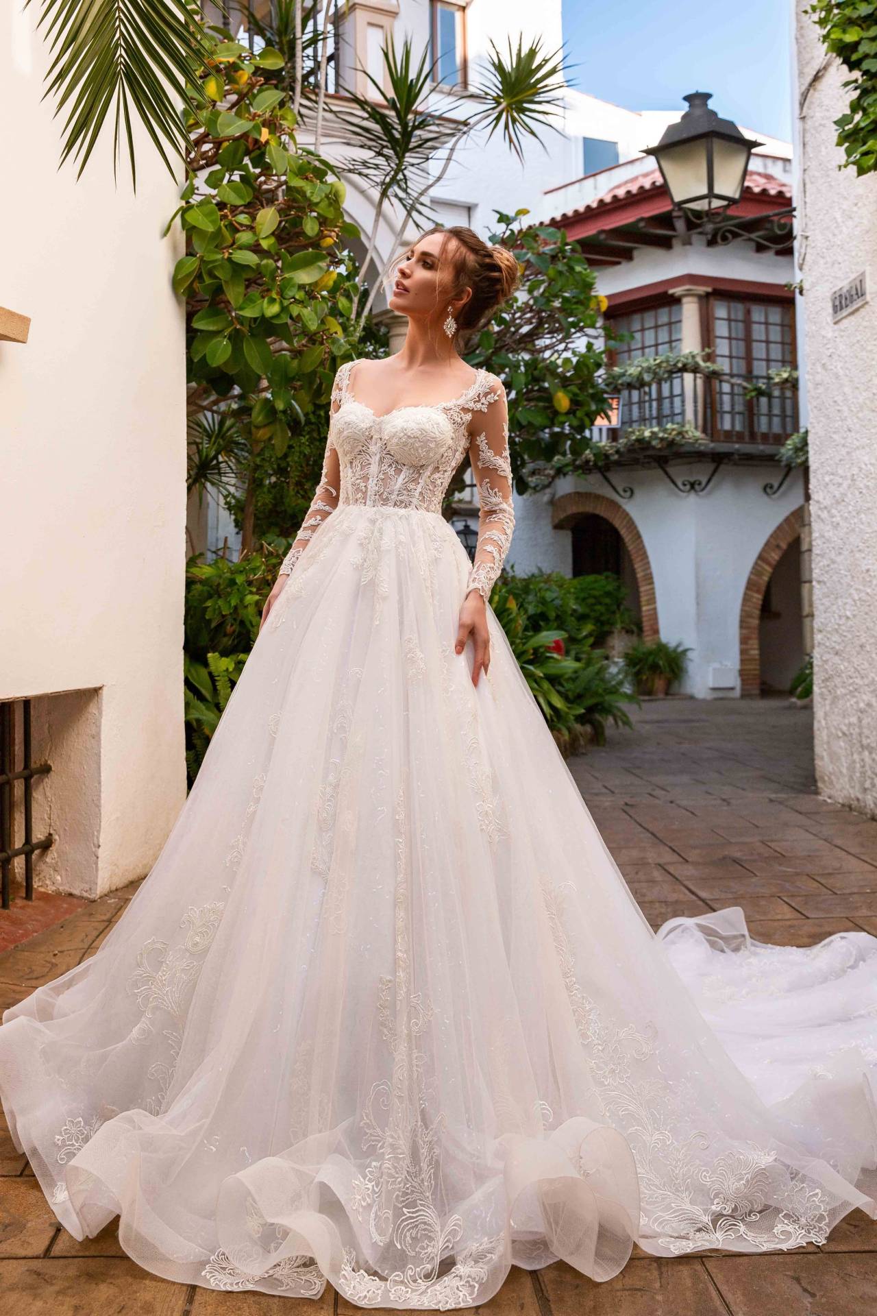 Rochia de mireasa San Jose este clasica si romantica. Dantela de pe bust cu forme de frunze este aplicata armonios pe tulle nude si incadreaza minunat spatele. Fusta este creata cu 2 straturi de dantela diferita care fac ca rochia sa fie unica si speciala.