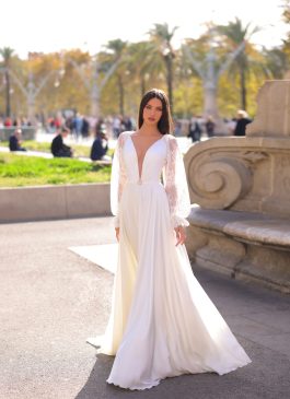 Dantela macrame este detaliul principal care caracterizeaza aceasta rochie. Rochia de mireasa Sol este o forma de sirena simpla si este potrivita pentru o nunta de vara.