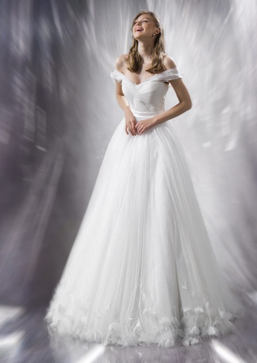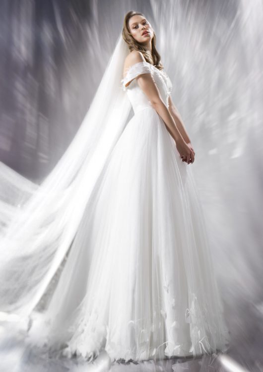 Desire este o rochie stilata si distinsa. Aplicatiile 3D cu fluturi si pene dau farmec rochiei ele fiind aplicate ca intr-o ploaie de vara. Aceasta rochie de mireasa este dulce si suava
