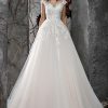 Rochia de mireasa Kalypso este diafana si incantatoare prin combinatia de dantela si tiul din matase. Bretelele fine si delicate intampina decolteul adanc si senzual.