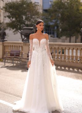 Rochia de mireasă este o abordare simplă și eleganta a eleganței clasice. Cu un corset bine croit, care îmbrățișează gratiozitatea siluetei, această rochie emană rafinament. Fusta amplă, din voal fluid, se mișcă într-un dans ușor în timpul mersului, adăugând o notă de mister și feminitate. Manecile bufante din tulle fin acoperite cu dantelă delicată completează perfect ansamblul, oferind acel „ceva în plus” pentru un look romantic și sofisticat. Această rochie este un vis împlinit pentru orice mireasă modernă și sofisticată.