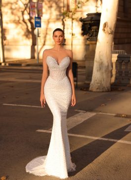Rochia de mireasă este o creație impresionantă, cu o siluetă elegantă în stil sirena. Confecționată dintr-o dantelă sclipitoare, aceasta emană delicatețe și rafinament. Corsetul cu balene este sculptat în forma unei inimi, evidențiindu-și subtil talia subțire și aducând un plus de romantism. Această rochie de mireasă promite să fie centrul atenției, transformând-o pe femeie într-o adevărată regină în ziua cea mare.